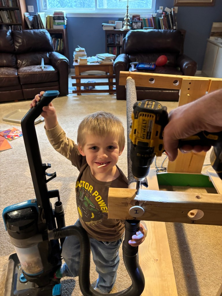 My very helpful dust collection system (Mommy doesn’t like sawdust in her carpet).