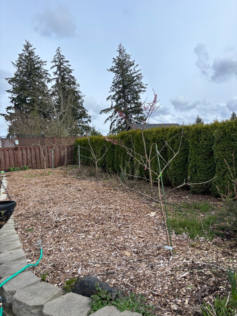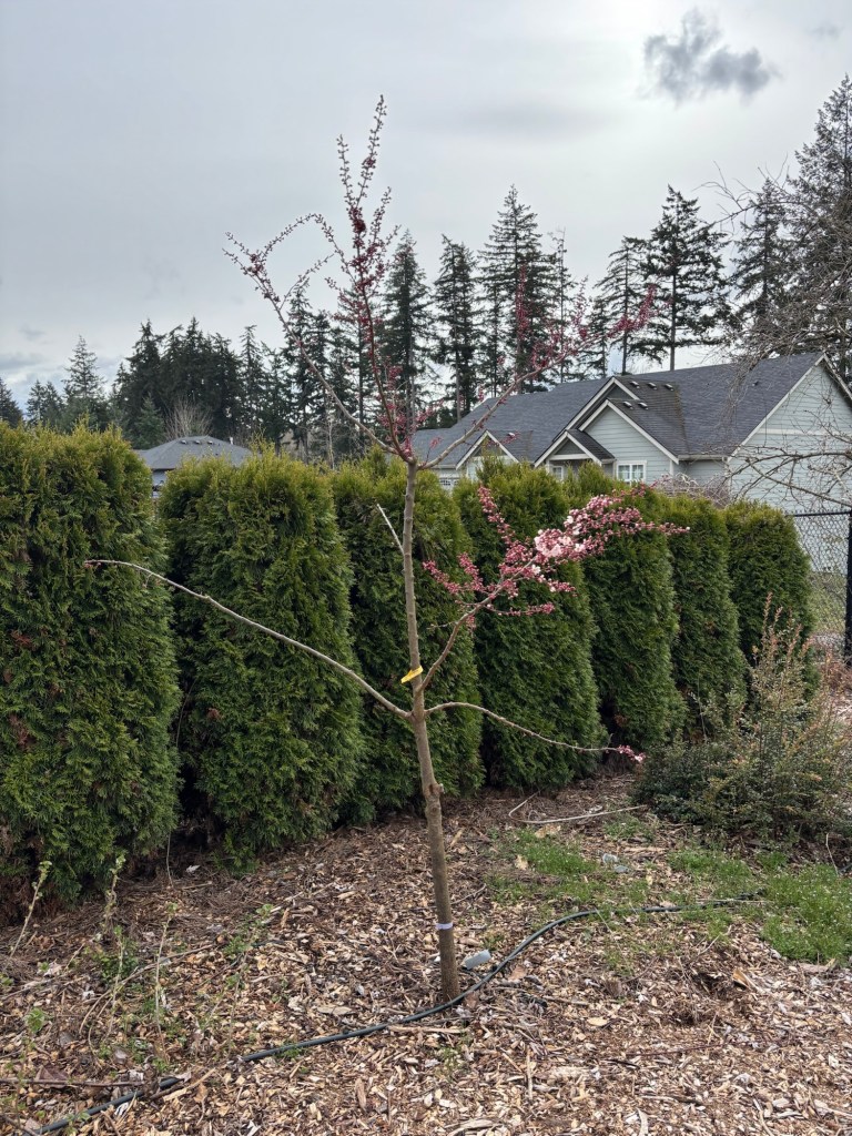 There are some buds on some of the trees. Especially this little Hollywood Plum. You can see the effect of microclimate on this plum tree. Only the parts that get sunlight over the hedge have budded yet. Hopefully the blossoms don’t all get blown off in a gale or frozen in a late frost this year.