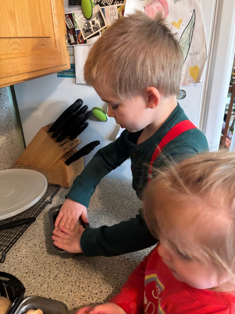 I can cut one of the lumps in half and Seppi and Winnie can each make a “baby loaf.”