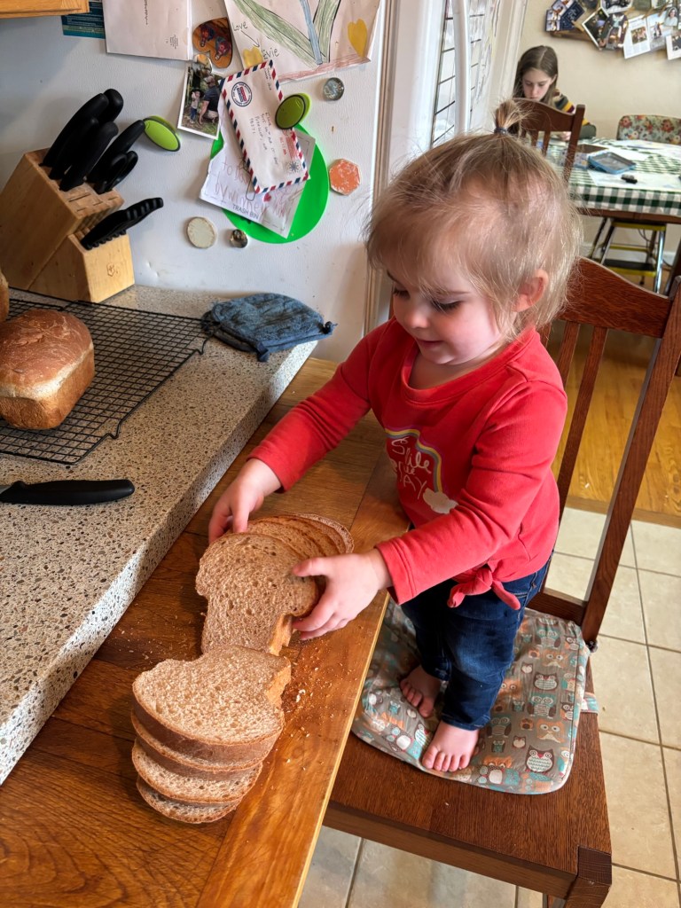 Since Seppi still doesn’t have very much school this year, and Winnie has no school at all (except for coloring “pretty pictures”) they usually want to be involved in the bread making process.