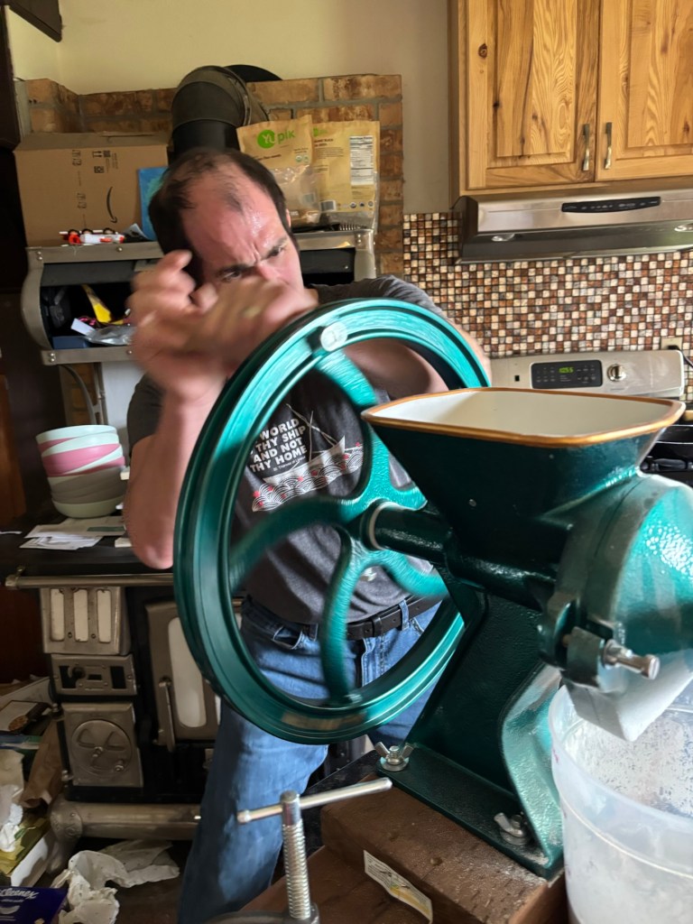 It takes about 15 minutes to grind enough flour for a large loaf of chala bread.