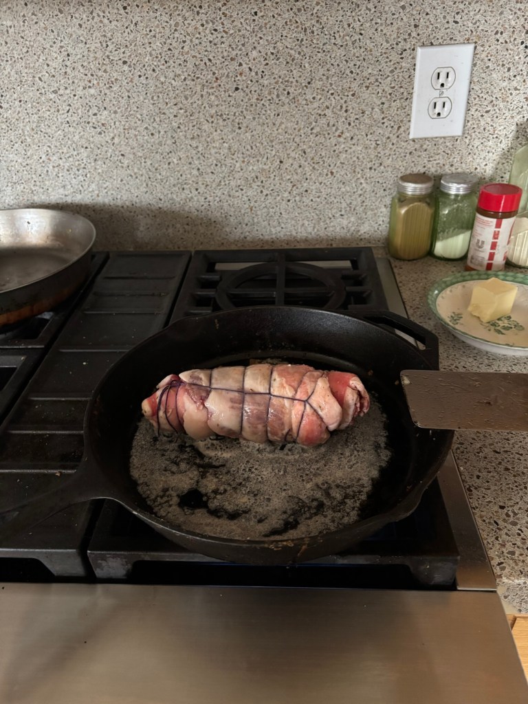 I was a little worried there wouldn’t be enough because it was such a small cut, about a pound and a half. First I unenrolled it, and laid it out skin side down, then rubbed the inside generously with rosemary, thyme, and black pepper. Could afford to be a little less generous with the rosemary, in future.