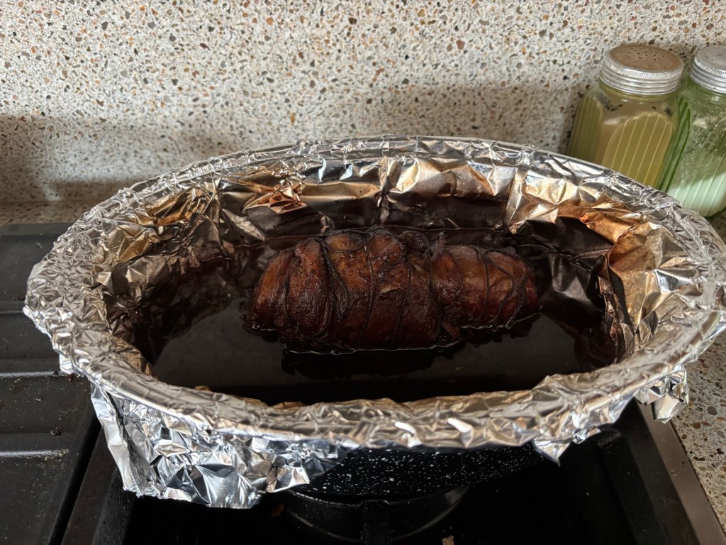 When we got home three hours later it was beautifully roasted so I just rolled it to coat the remaining side and let it sit in the hot pan for 30 or 40 minutes.