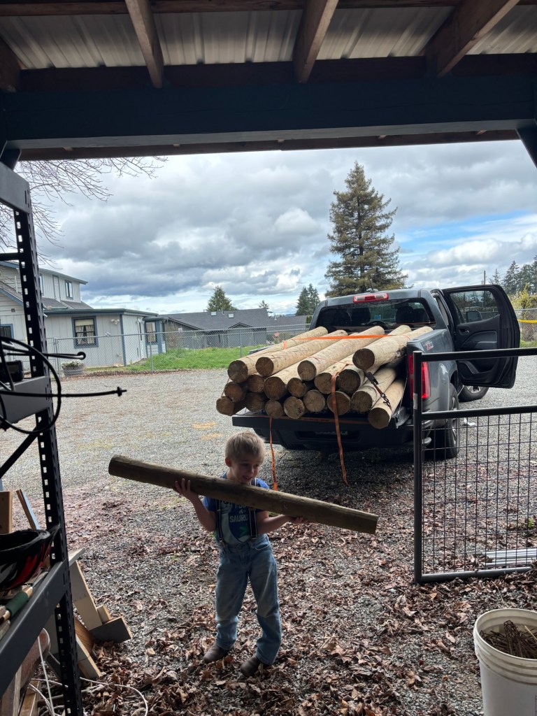 Monday Daddy and the two youngest went down to TSC to pick up some fencing supplies for our next project. We loaded them in the bed of our long-suffering pickup truck.