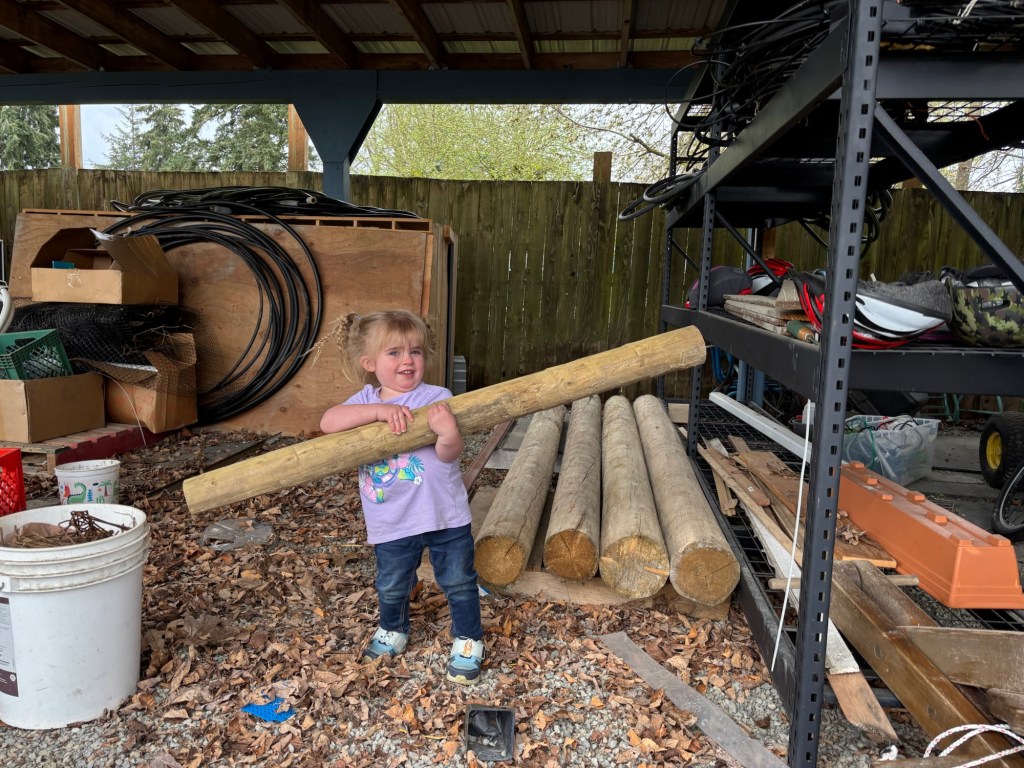Seppi is very proud of himself. He can pick up a small fence post all by himself.