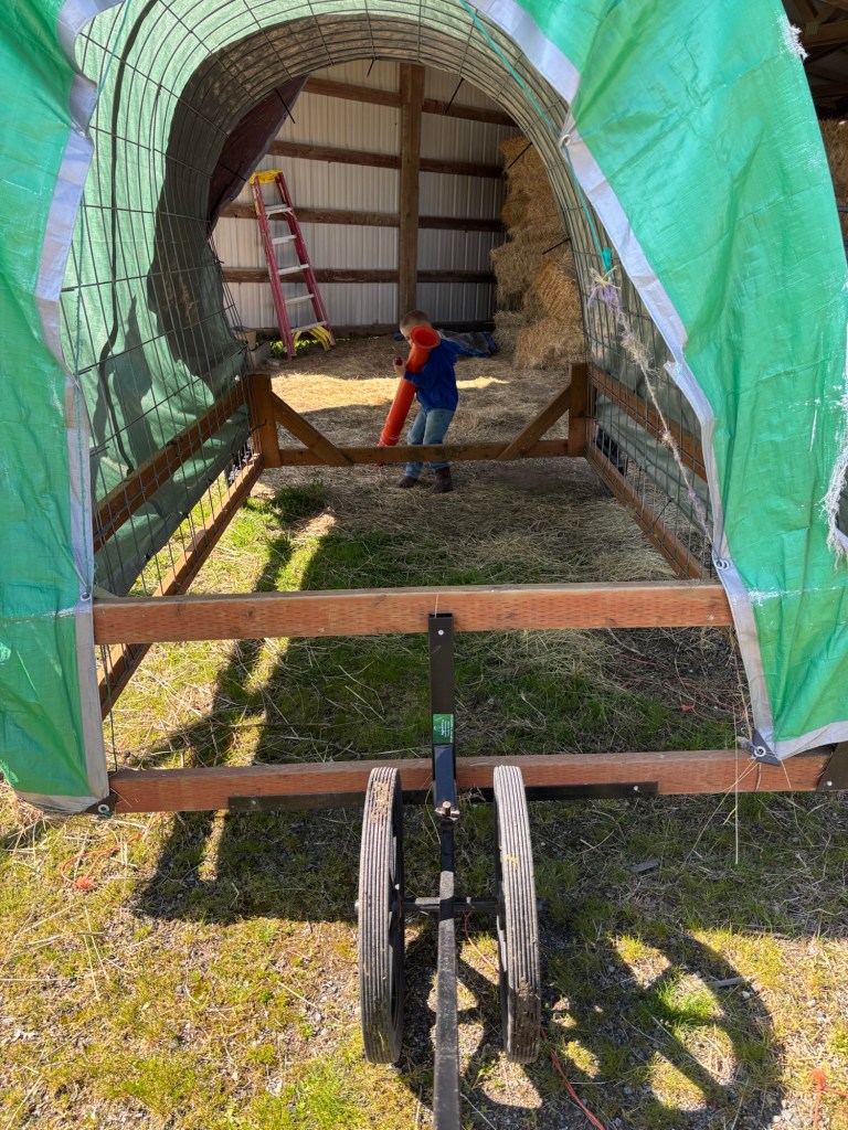 Time to move the shade mobile out there. It has been unseasonable sunny for the last few days, and the steers need a place to lie down in the shade to chew their cud. This shademobile is a little skewed from getting rolled over in a wind storm this winter, but the frame is still solid.
