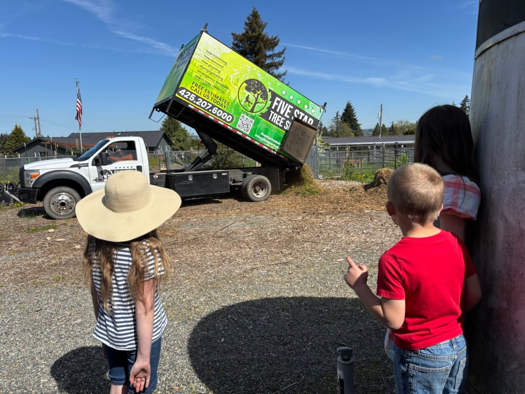 More woodchips! The kids loved watching them get dumped off. But they loved playing on the pile of woodchips even more. They are always very disappointed when Daddy and Uncle remove those wood chips for actual mulching and such.