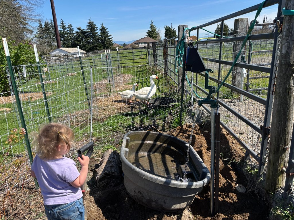 Then we dumped out the nasty duck and goose waters, rinsed out the troughs, and re-filled them with nice clean water.
