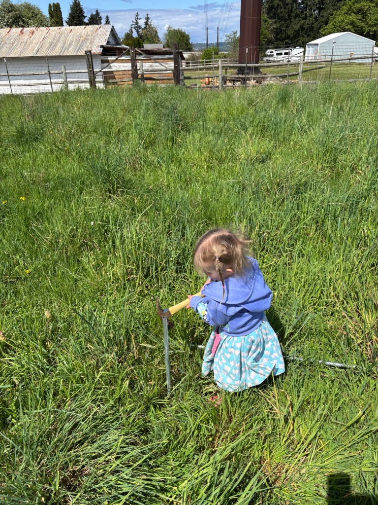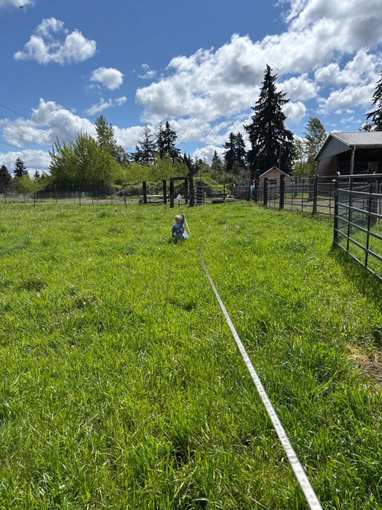 One of the most laborious tasks of the rotational grazing on the two main pastures at the farm is running of the long center line fence. This takes a full morning or afternoon to move every time we need to move from the North to the South Pasture, or vice versa. The long bundles are too heavy for anyone except Daddy or Uncle to move.