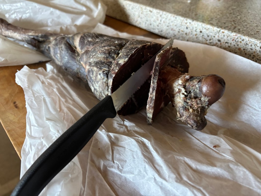 We got behind on our lamb prosciutto experiment, so we didn’t get around to taking down the last leg on the day after Easter.