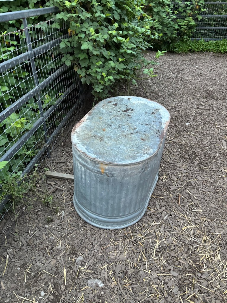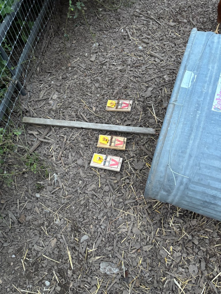 And, just to keep the chickens from getting their silly heads stuck in the traps, we put an upside-down stock tank over them. Don’t worry, that will not keep the rats from getting to the peanut butter if they want to.