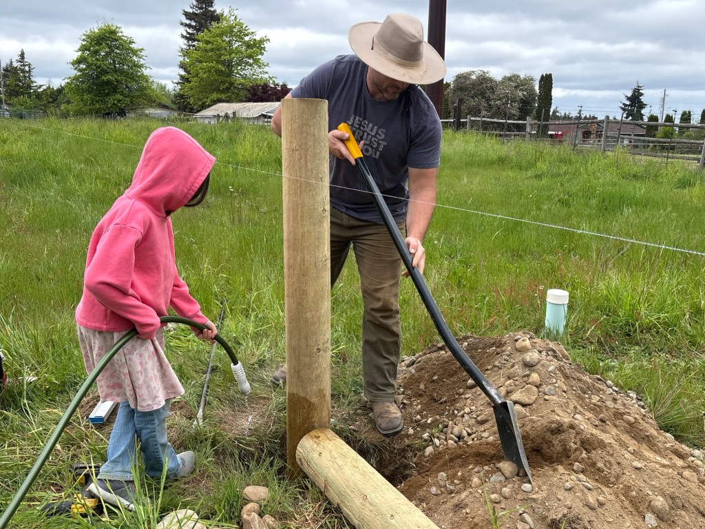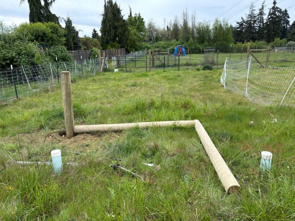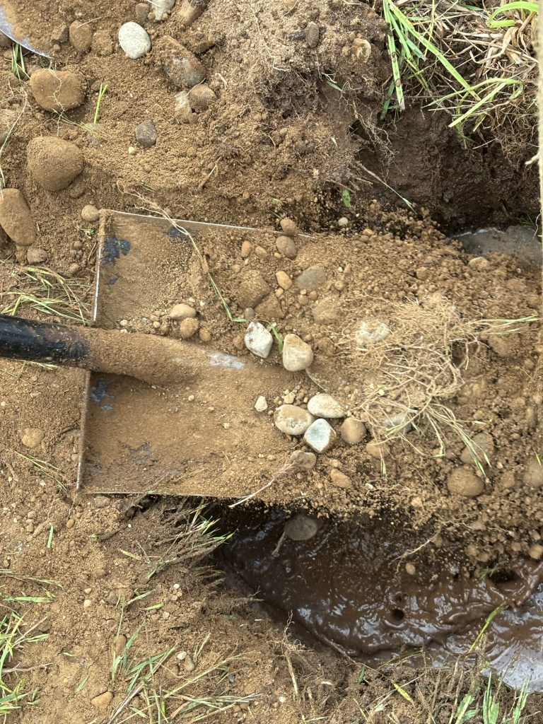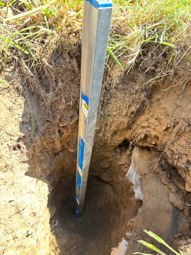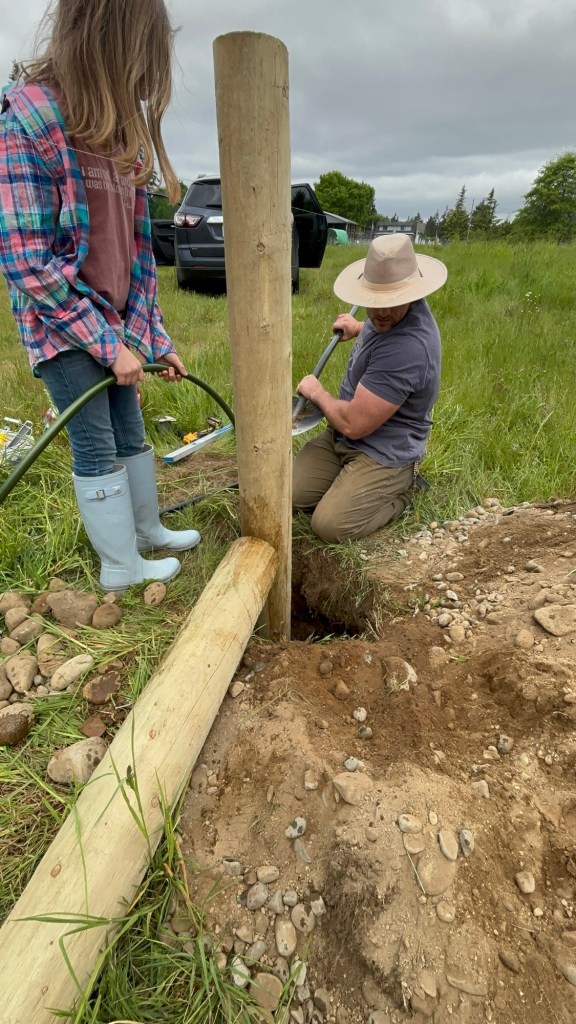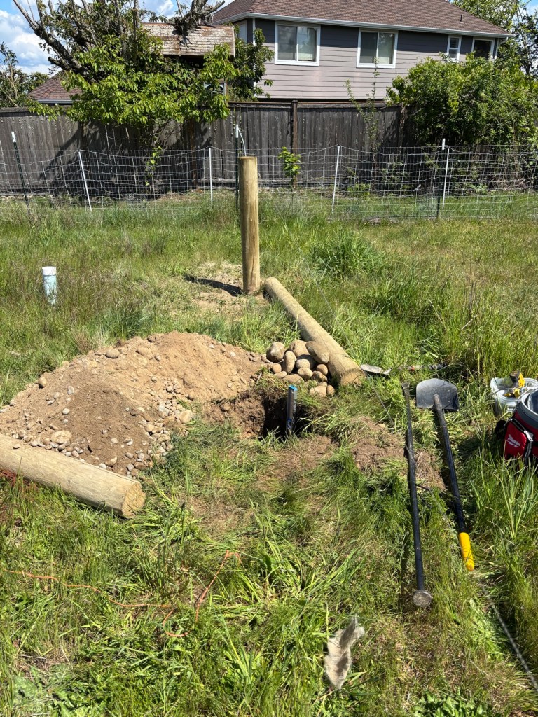 The hole is carefully placed to miss the drainage line. This is why we put a 10 foot gate here instead of a 12 foot gate.