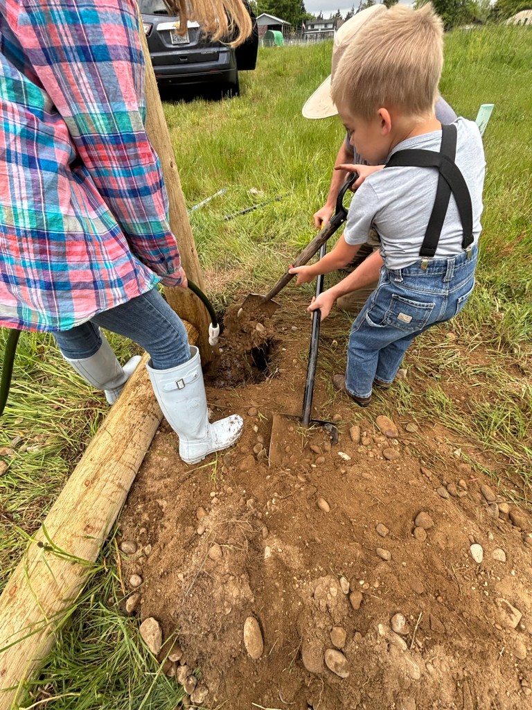 After the first layer of dirt in the bottom of the hole, we tamped rocks in a ring around the post, then more dirt.
