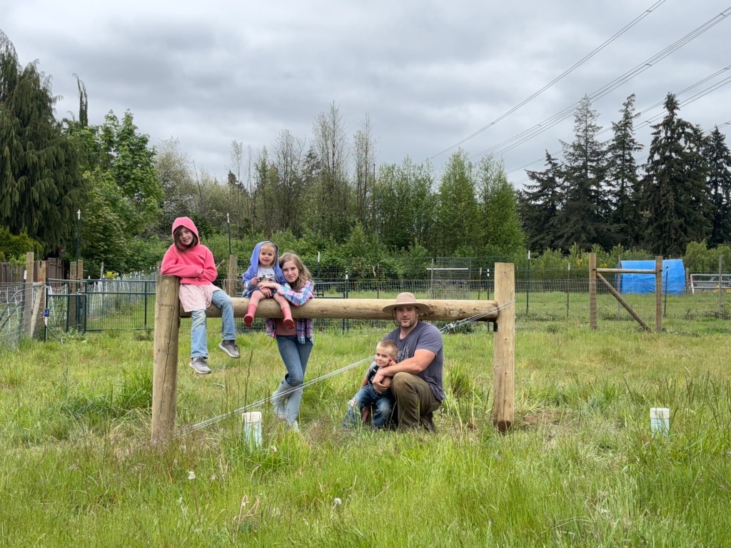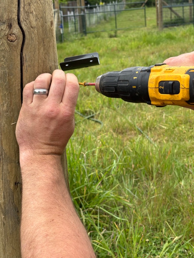 Evie putting in the last couple of screws on the brackets, while Seppi helps pick up the tools.