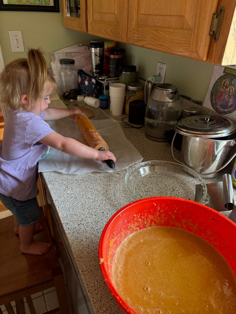 Winnie is pretty sure she is big enough to do everything. If you tell her she is too small she assures you with complete confidence “I know how to do it.” What she lacks in size, she makes up for in attitude… except rolling pin skills. Rolling out a pie crust just takes a certain amount of strength and size, no matter how hard you try.