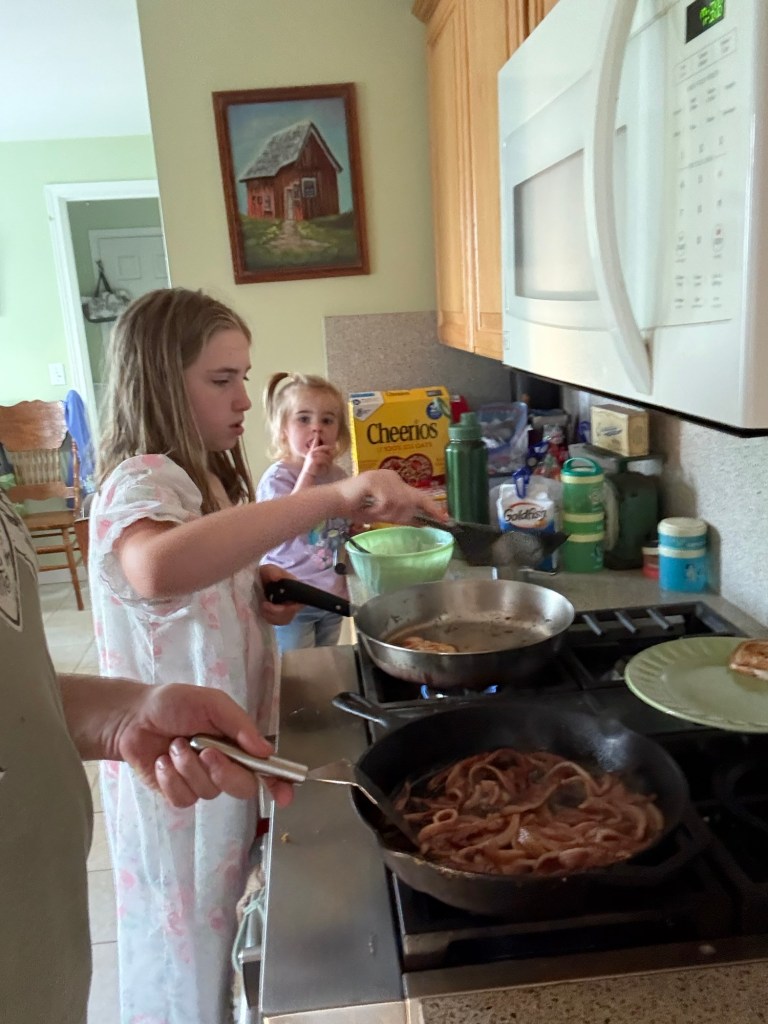 Pancakes and bacon for breakfast. I notice that, as my brother pointed out on this recent Tennessee trip, my tummy sticks out a bit further than it used to, as can be seen from this picture. I am sure I don’t know why.