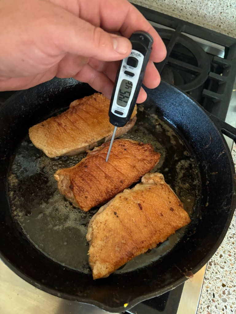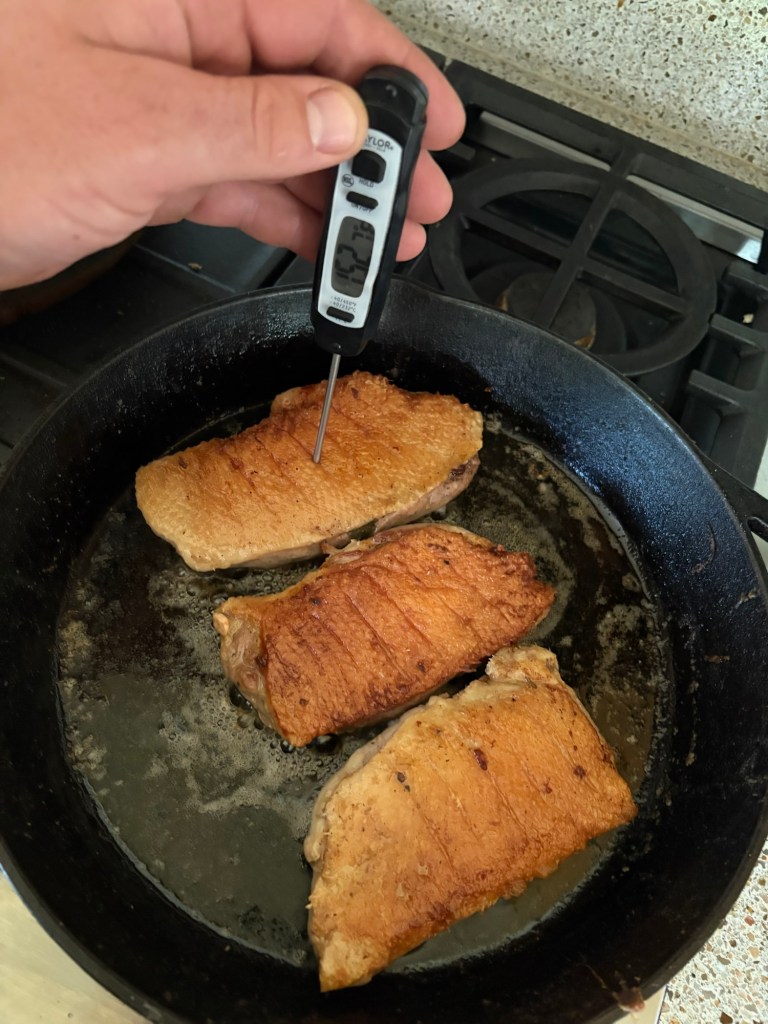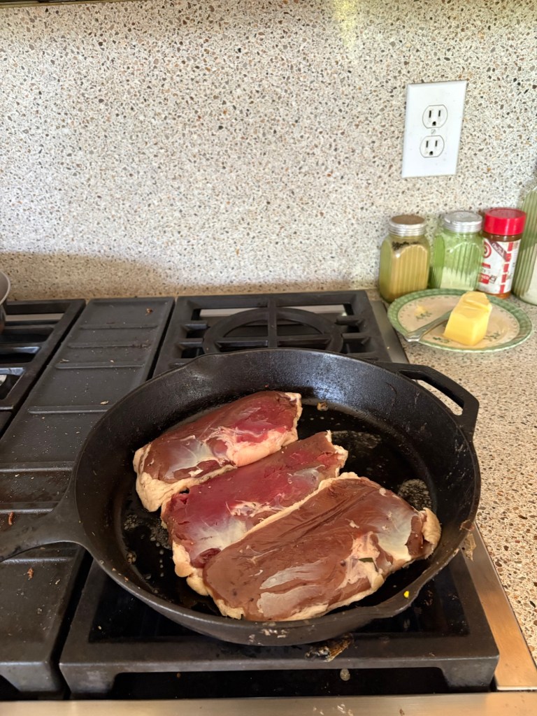 Duck breasts lightly salted and seasoned! Slit the skin with several slashes, that do not go all the way to the meat. This is to let the fat drain out.