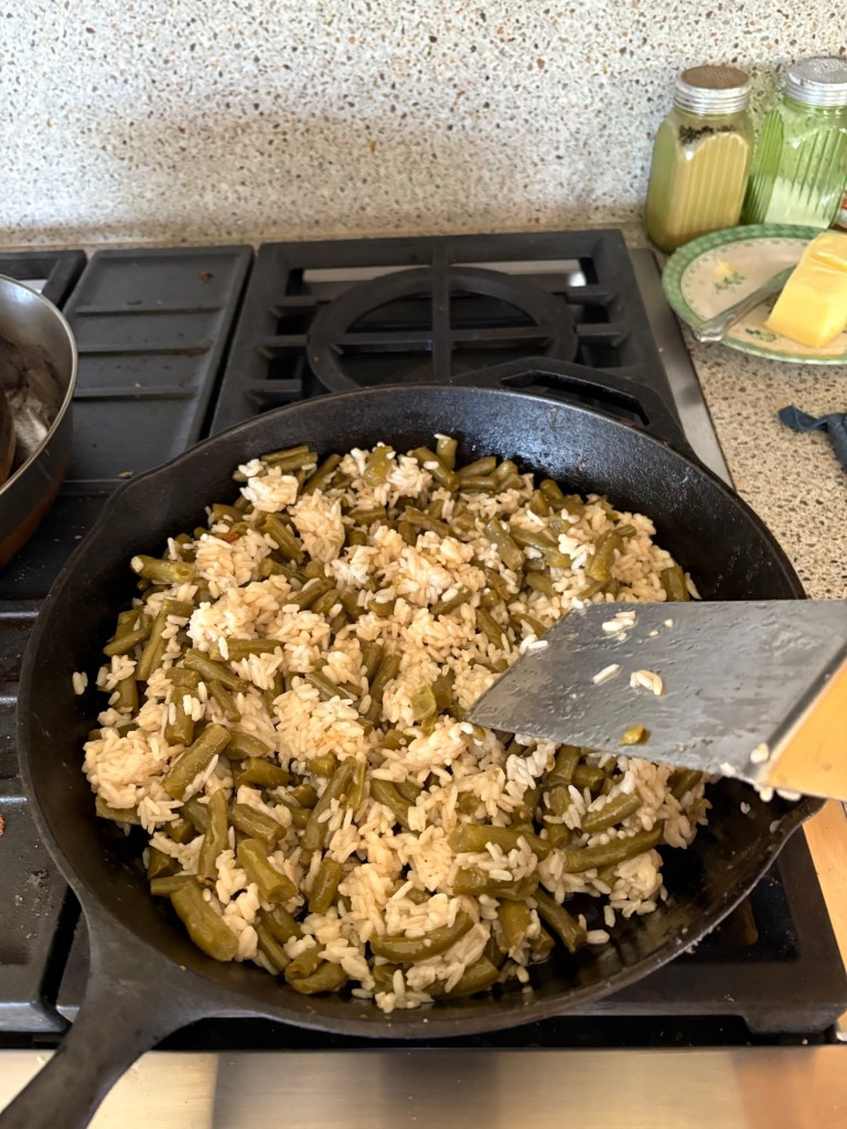Then stirfry the rice and beans in the rendered fat, while the duck cools.