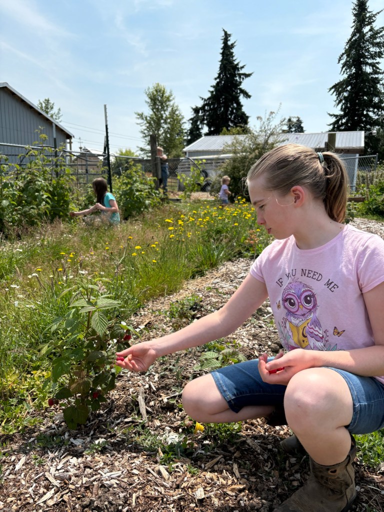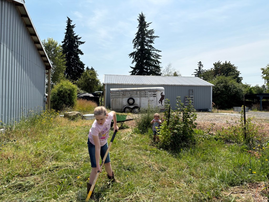 Evie, cleaning up the cut grass and weeds to put on the compost pile.