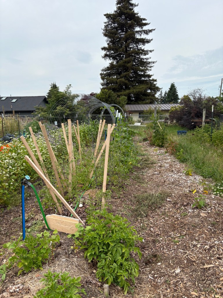 Squash is continuing to grow up the sides of the trellis, while buckwheat grows up against the other side of it.