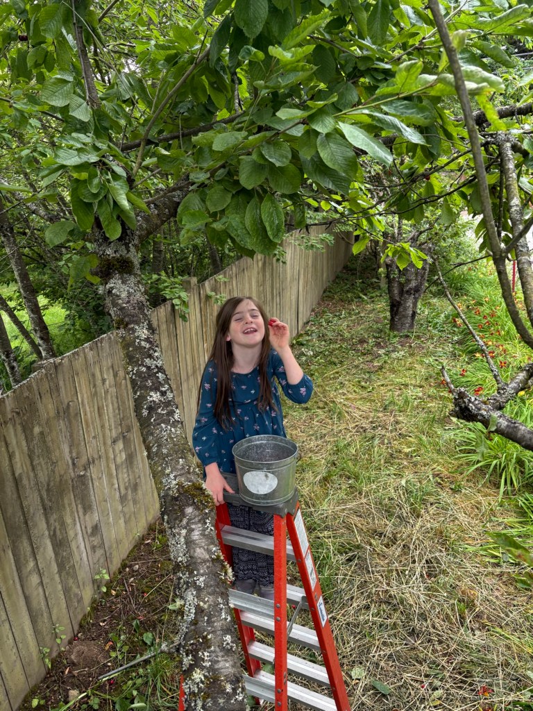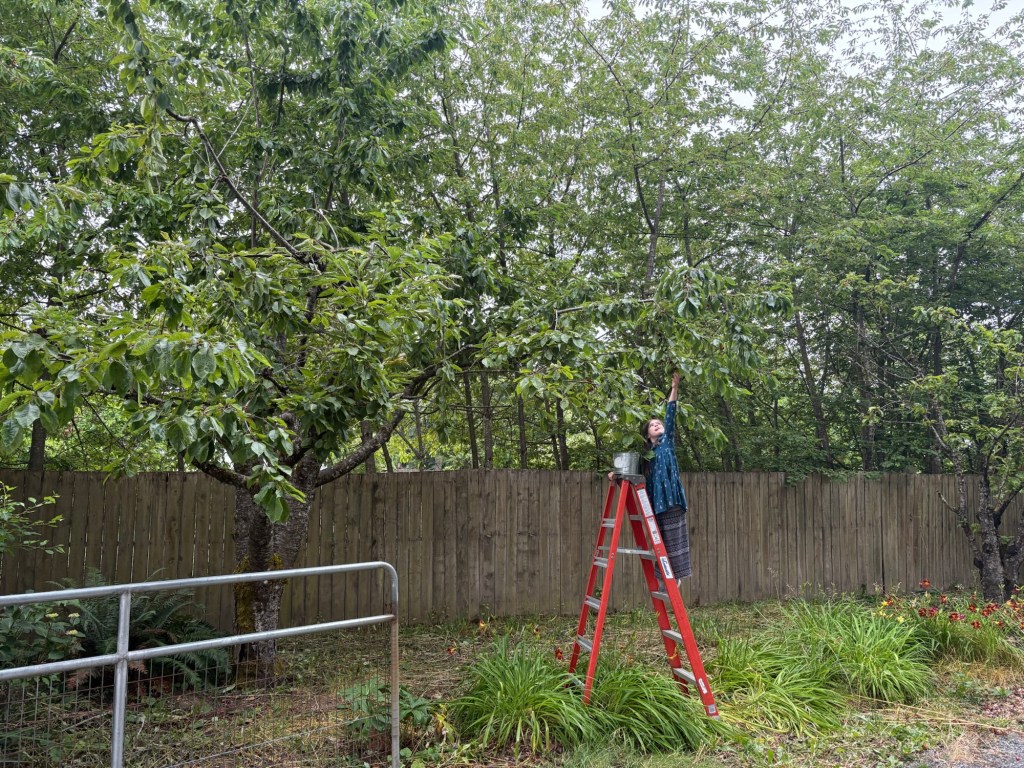 Even with the help of the ladder, Ellie couldn’t reach all the cherries, and the robins found the tree in the last few days. They knocked down or ate basically every cherry in the top branches, so it was slim pickings.