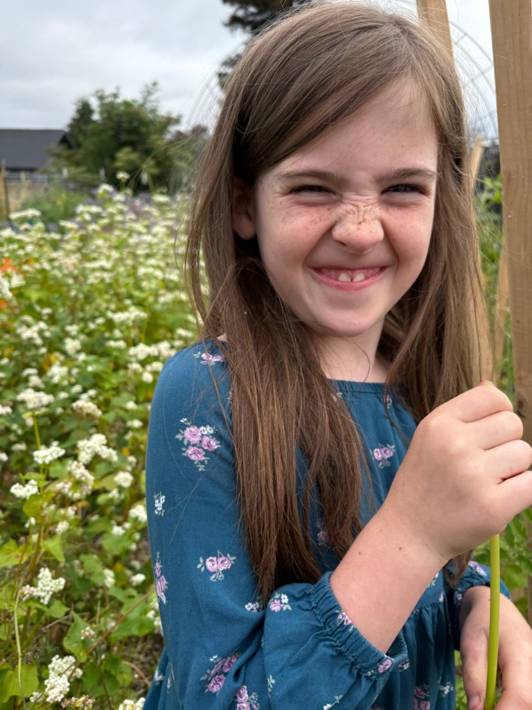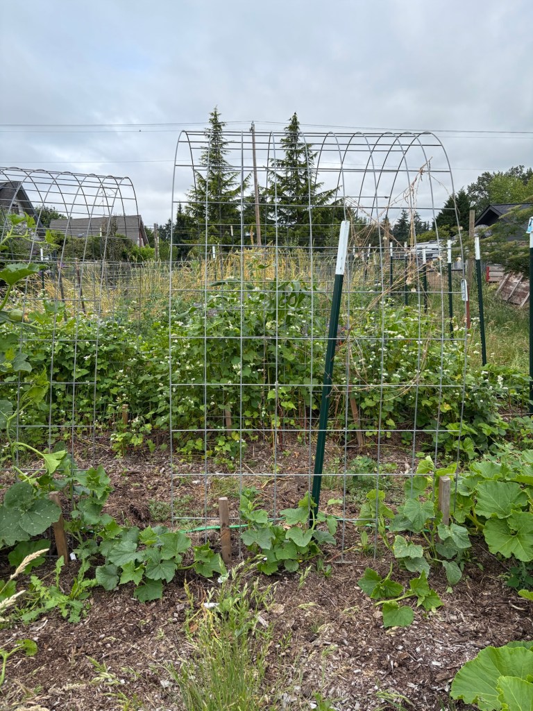 Next we stopped by the garden and continued training the cucumbers…