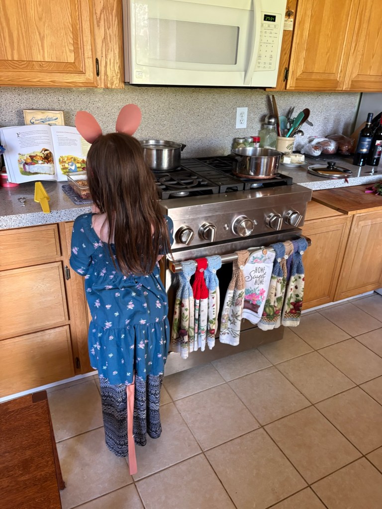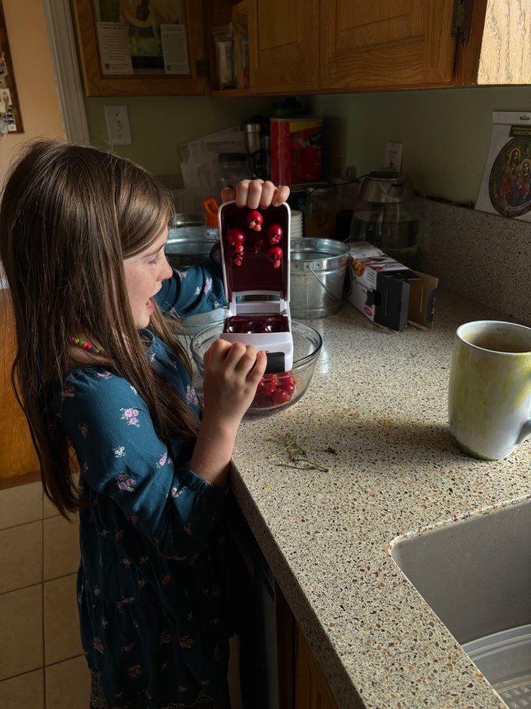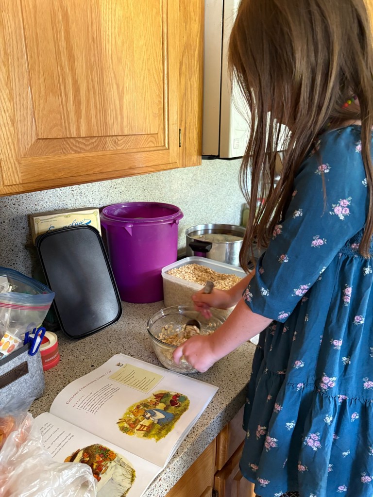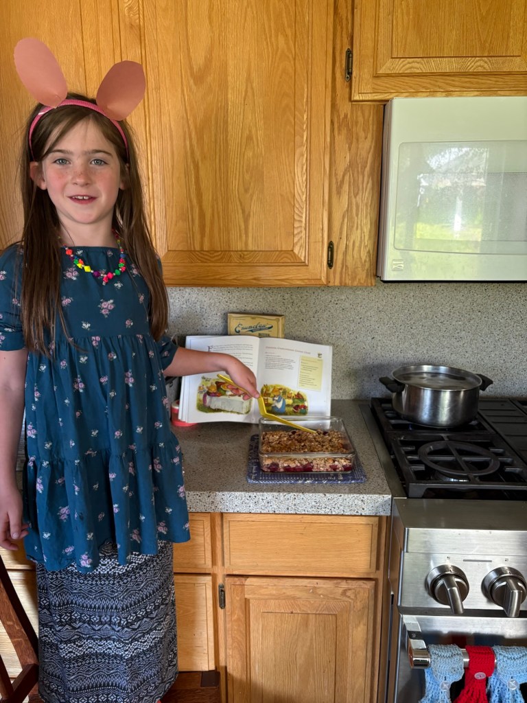 We haven’t gotten up the energy to make a Redwall feast yet, but since our cherries are in, we did let her make a Cheerful Churchmouse Cherry Crisp (pg. 35). On Friday, Daddy told her that she could make it, if she came to the farm early when he did chores to pick the cherries.