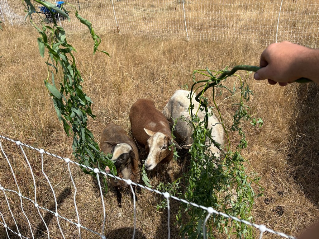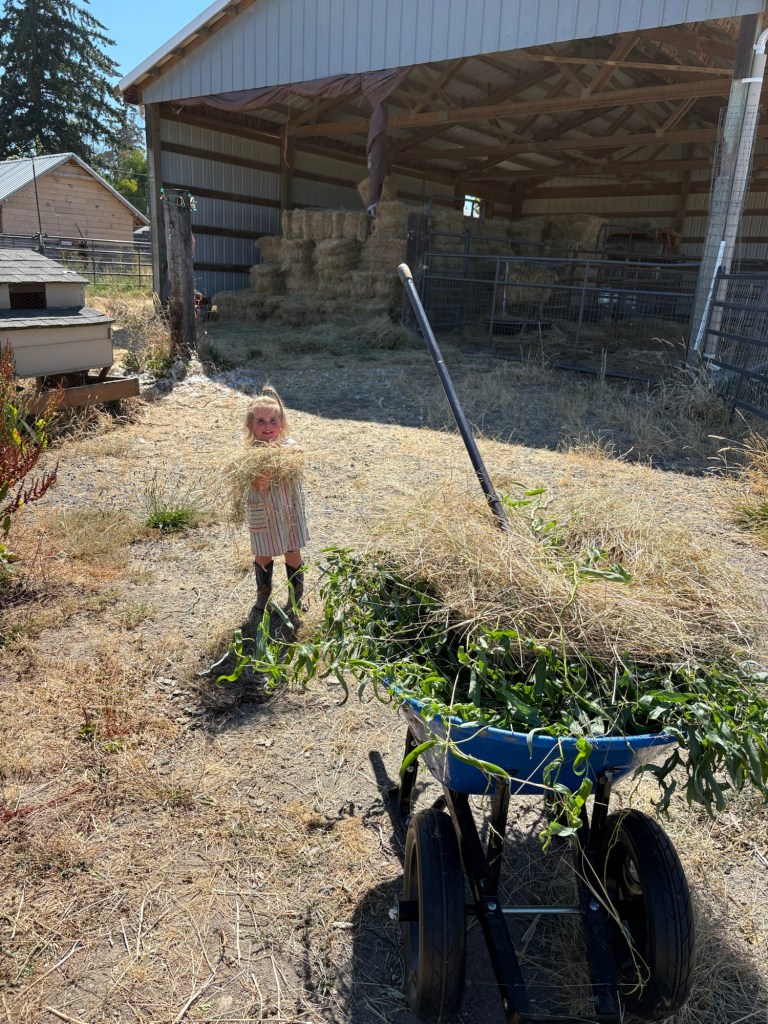 Last job on the farm is a fun one. About three in the afternoon we pull some weeds (bolted radishes and clover) and put them with some willow cuttings and some hay into the wheelbarrow and take it out to the pasture.