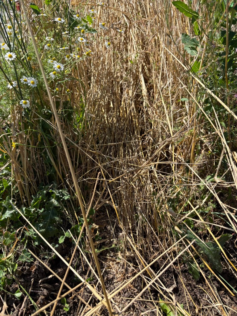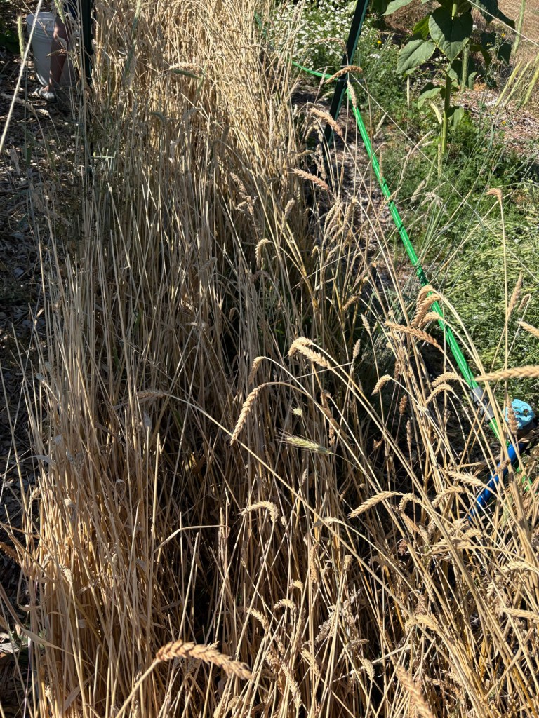 Around 2 o-clock we finished harvesting the wheat. 210 square feet, 5 Lbs of seed, produced about 11 gallons of seed heads.
