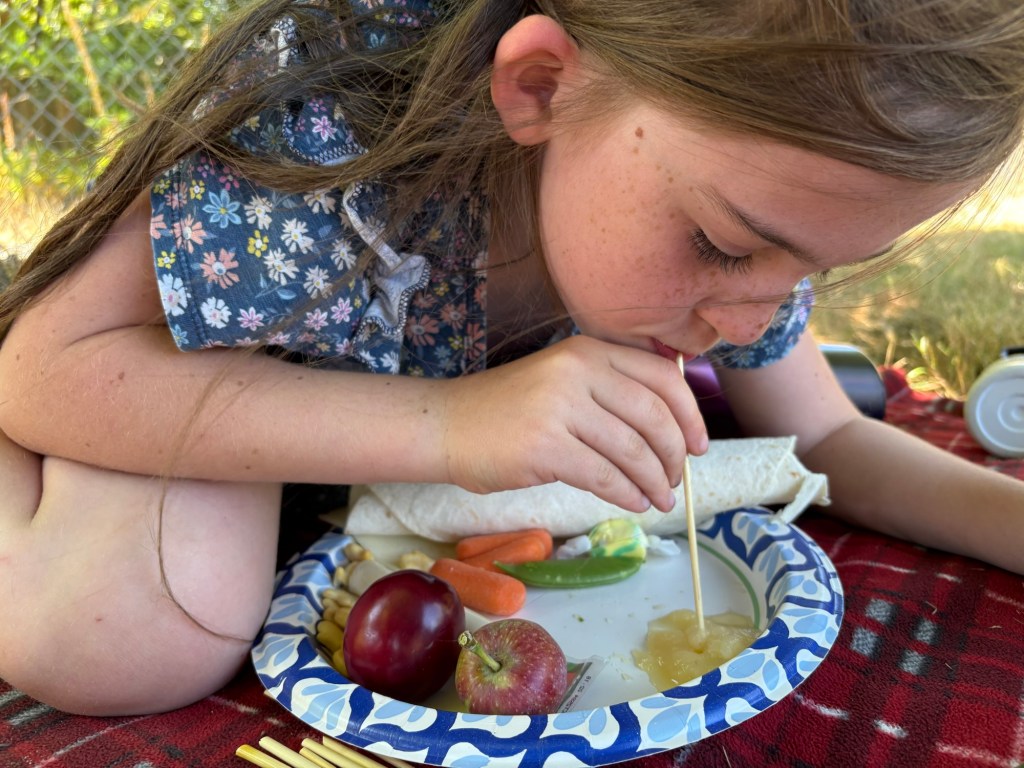 Evie served us some applesauce, but forgot to bring out spoons. Not to worry, Ellie has a solution.