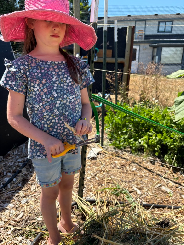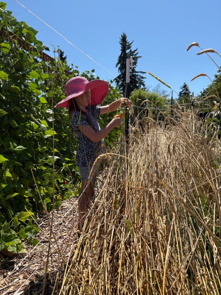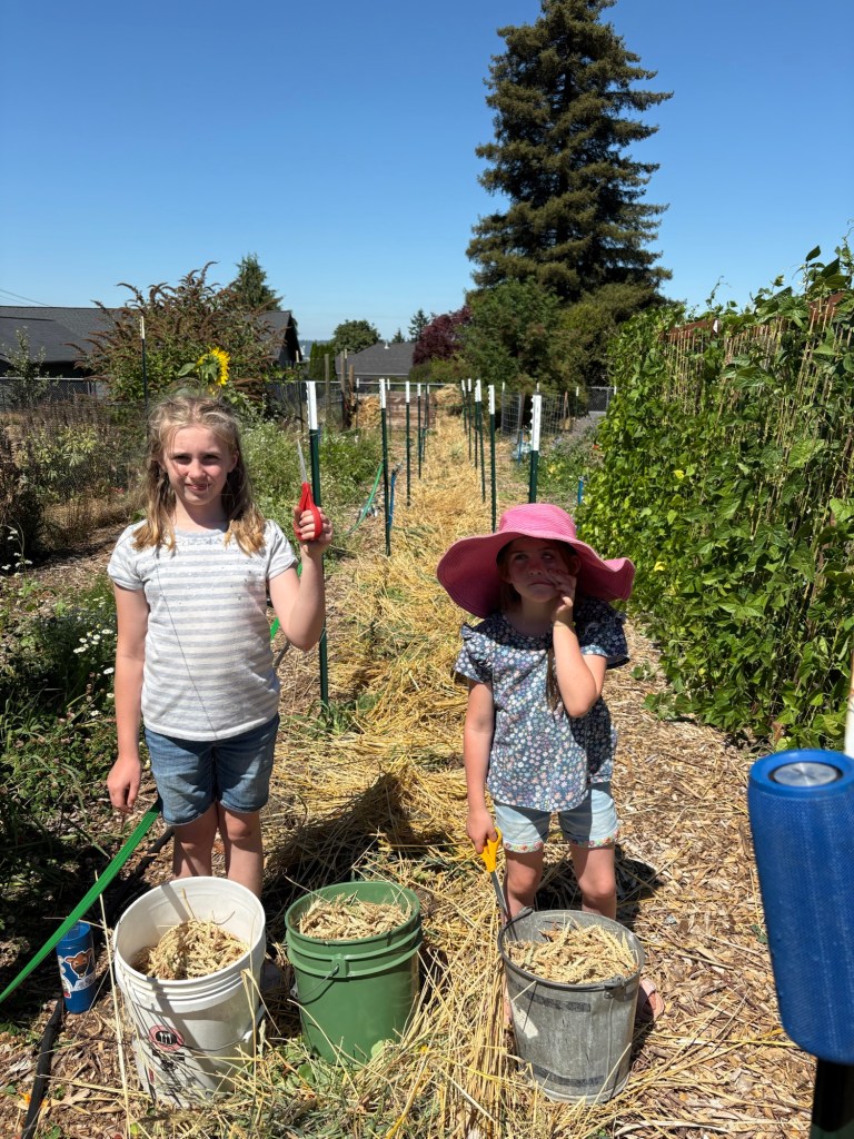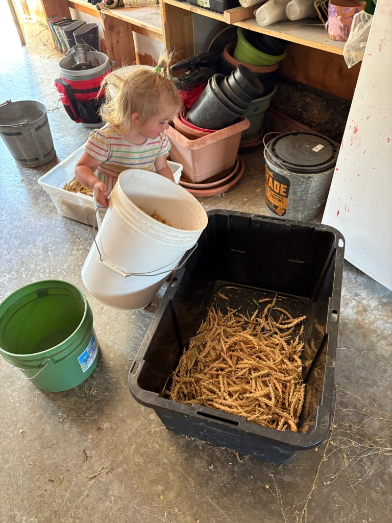 Instead, we left it standing and harvest the heads themselves by hand. The two older girls cut the heads off with scissors and dropped them in buckets. I went behind them and broke the stalks off, plucked the remaining heads and put them in buckets, pulled the weeds, and crumple the whole mess of stalks and weeds up, to form a base of organic matter under the row which is (hopefully) going to be our winter root crop row.