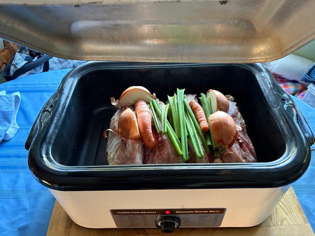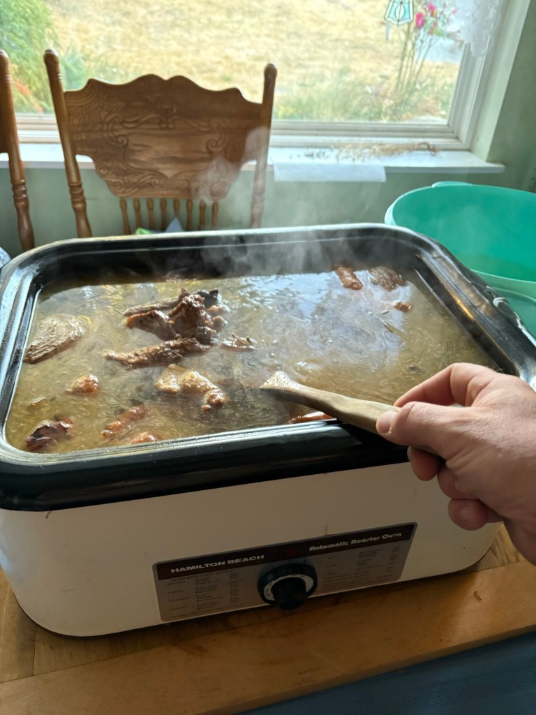 Then added water with a dash of vinegar and some salt, and set it to simmering. We kept an eye on it for a couple of days, topping it up as the water steamed off. You do not want the water to boil off.