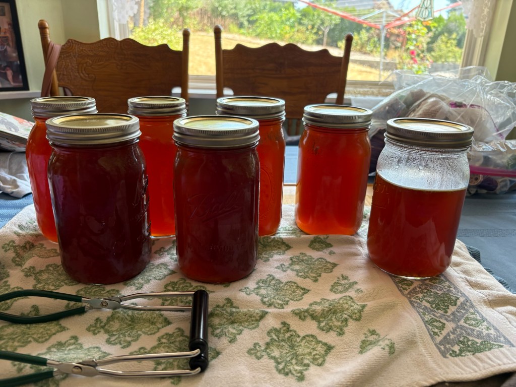 The strained liquid was left to cool on the counter until about bath water temp, and then put in the refrigerator to chill until the fat layer had formed. On Friday Kathleen pressure canned them. Only one of them didn’t seal, as sometimes happens.