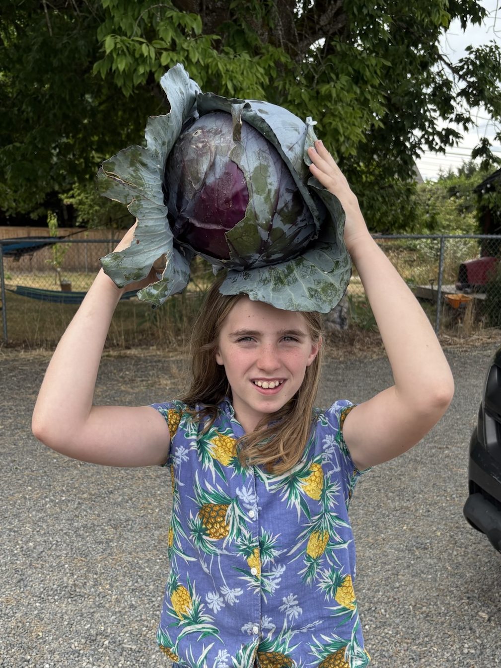 This cabbage was one of the late planted cabbages from last year that didn’t sprout in time for winter, but took off as soon as the ground started to warm up in the spring. It has been growing next to the pea trellis ever since.