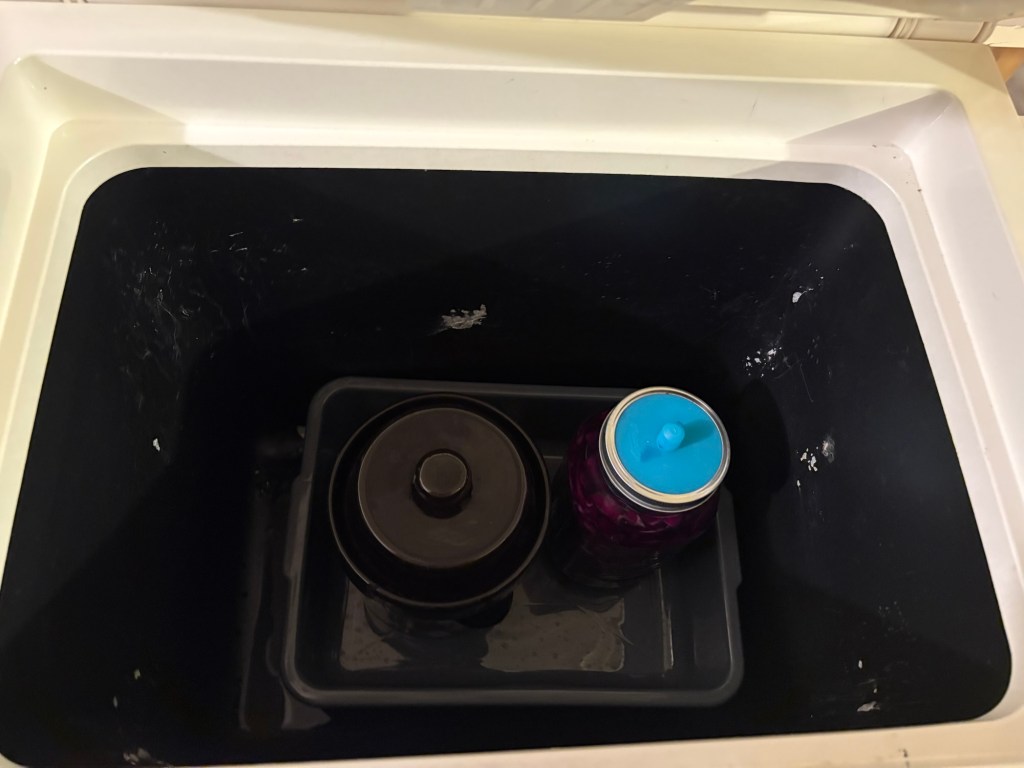 The inside smells like kimchi (surprise!). We put in the 1/2 gallon jar and the 1/2 gallon crock (in a bus tub, in case of leakage), and then later a quart of dilly beans.