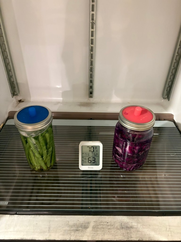 As a control, we put a quart of kraut and a jar of dilly beans in the dry fridge, (ambient basement temp) to see how they do.