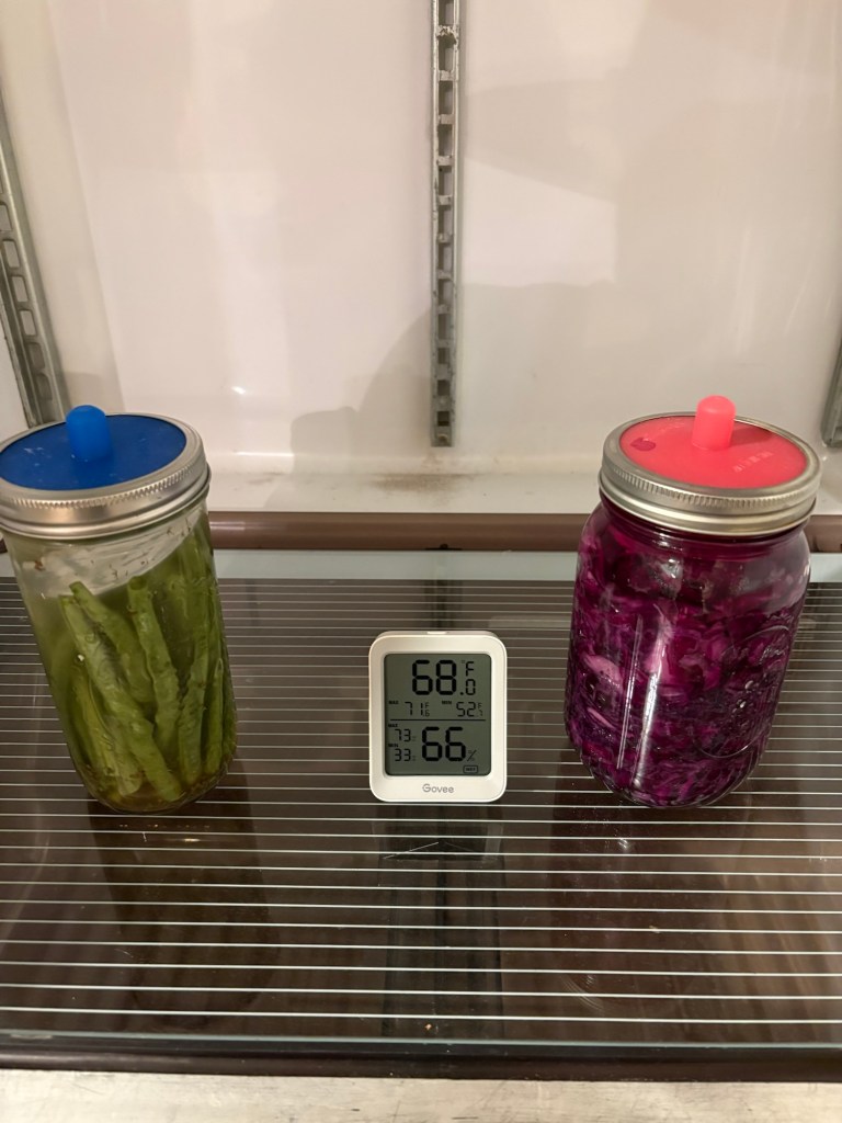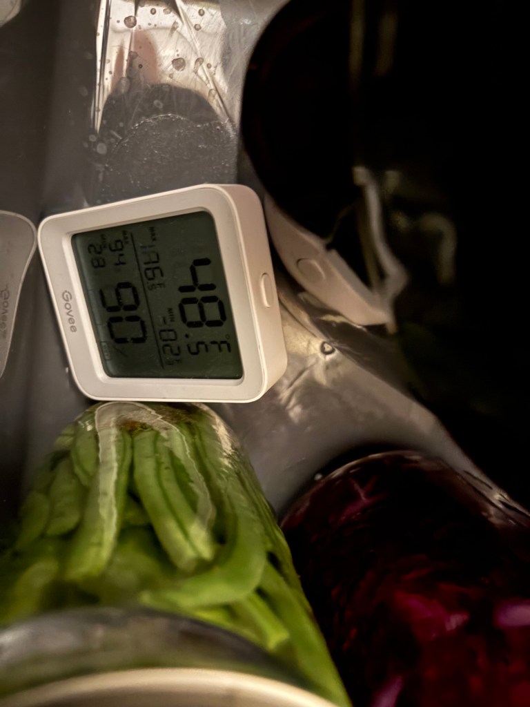 After letting the ferments from the kimchi fridge warm up a bit we put it back on “hot fermentation setting” and put them back in the fridge.