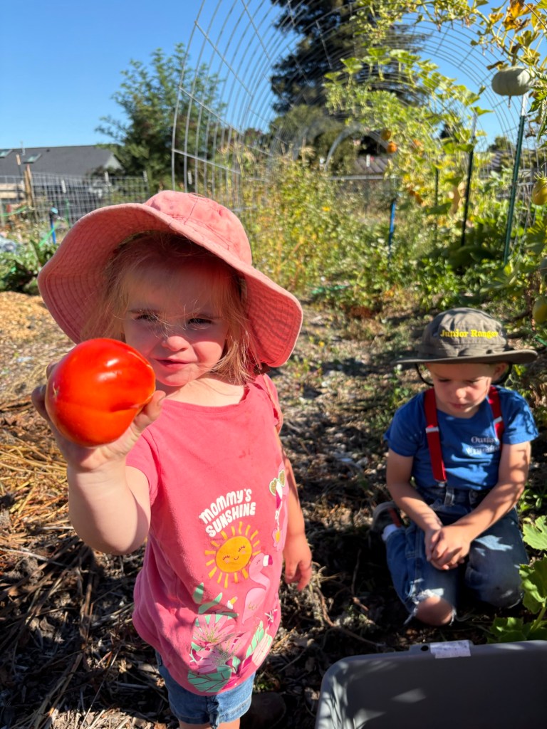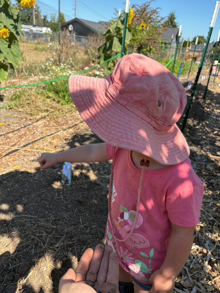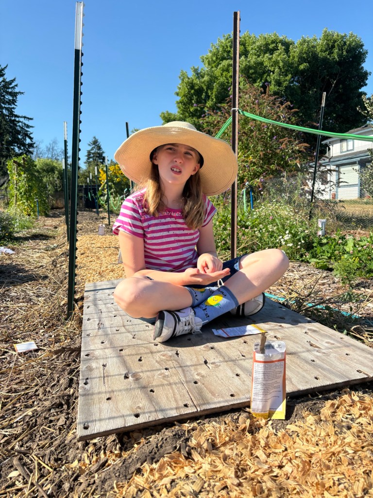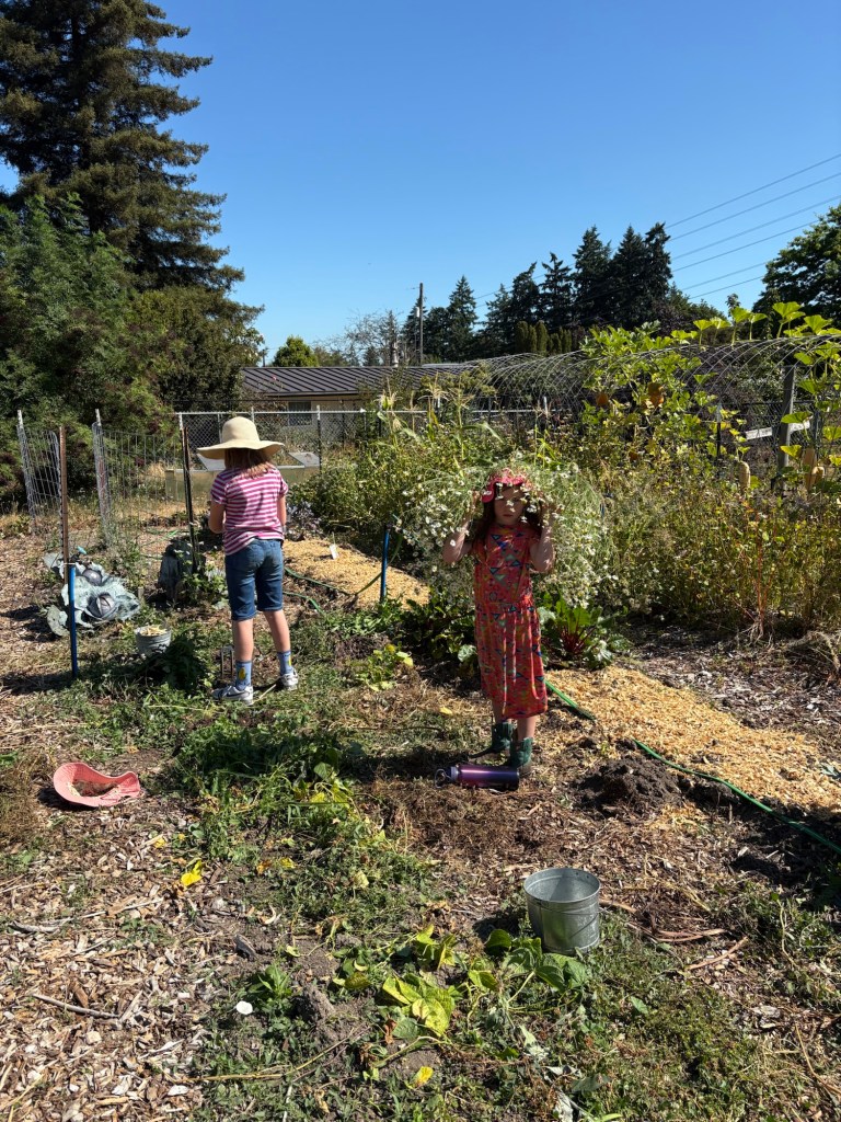 Ellie and Evie pulling weeds, preparing this bed for wheat planting. Ellie made a hat out of a chamomile plant.