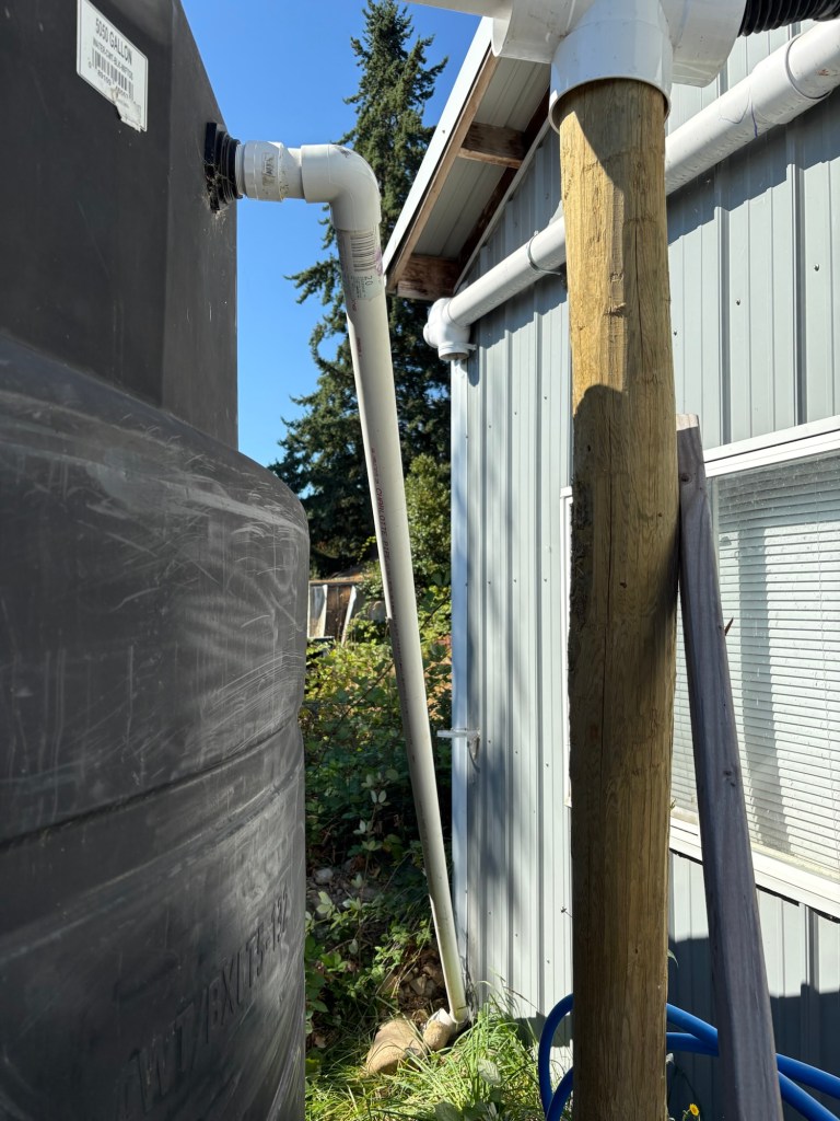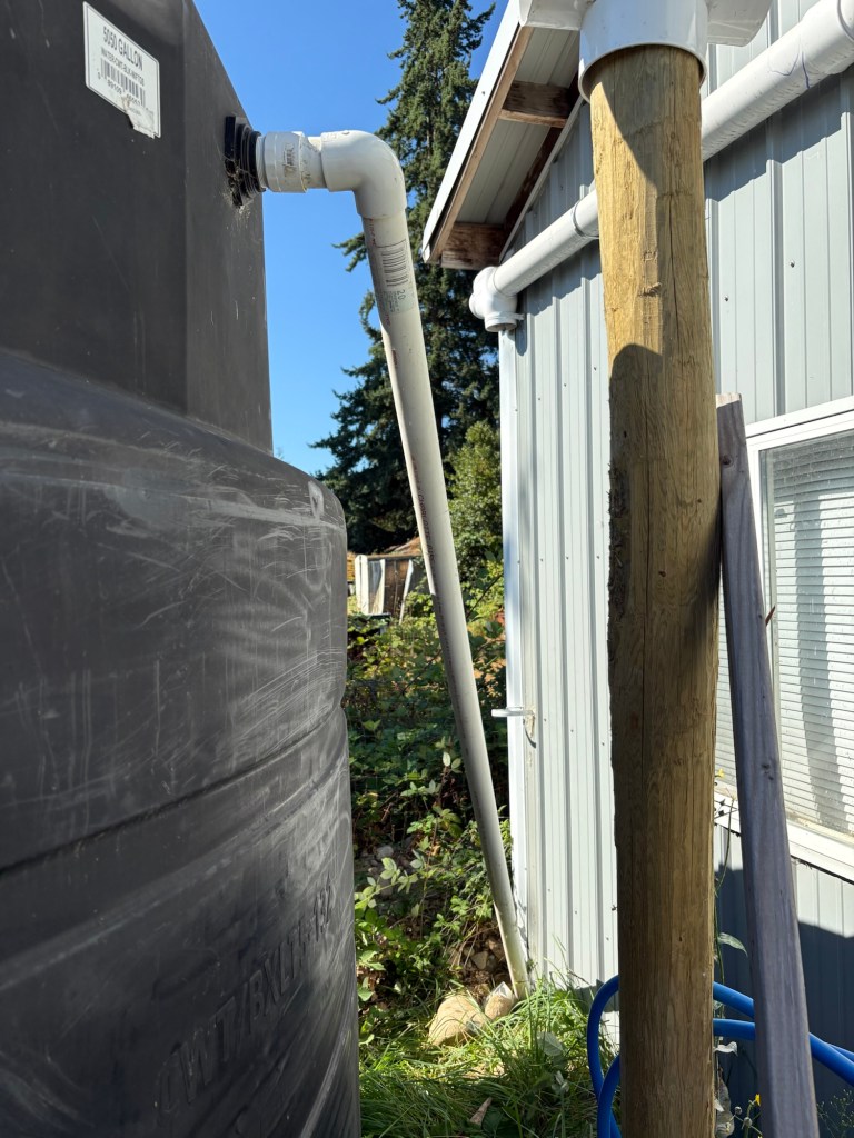We installed the overflow on the rain tank on Tuesday as well. This is so that when the tank is full, it will drain into the rain tank underground, and eventually make its way to the leach field in the pasture.