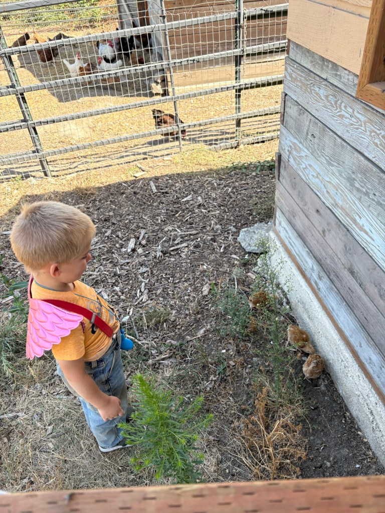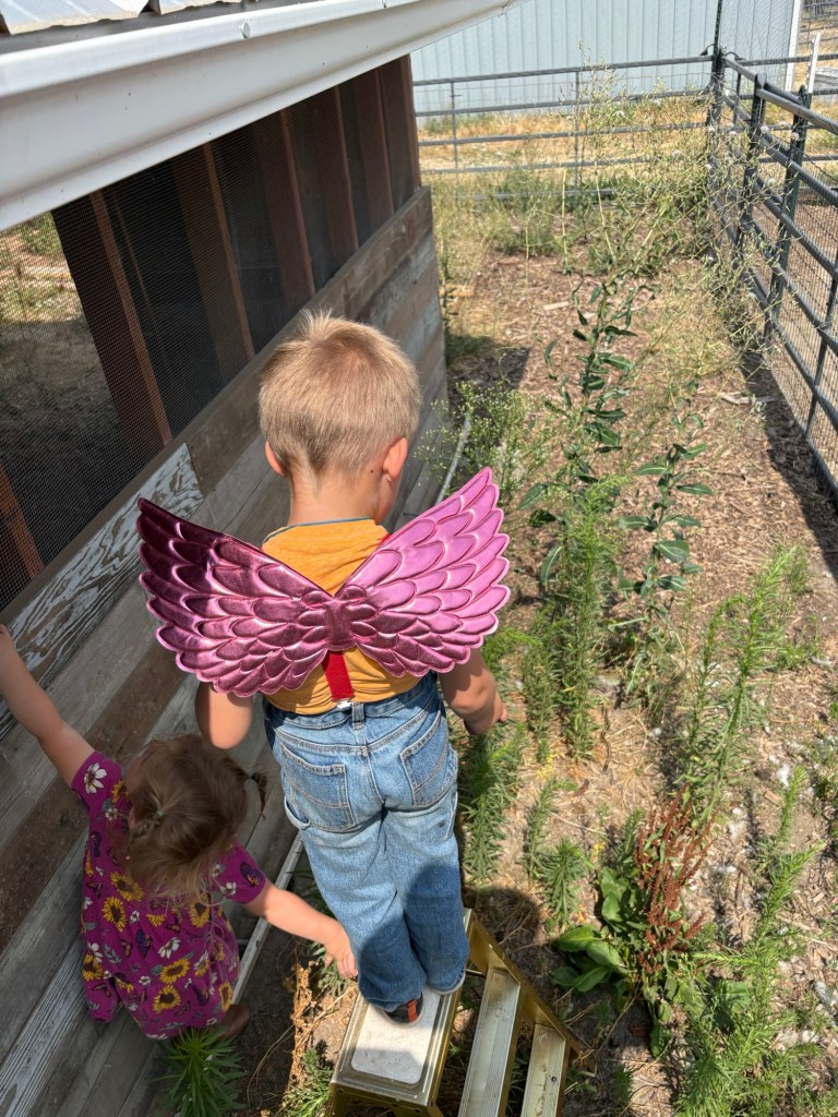 Seppie and Winnie and Daddy fixed that with some glue and roofing screws. While doing this job we stopped to chat with some chicks.