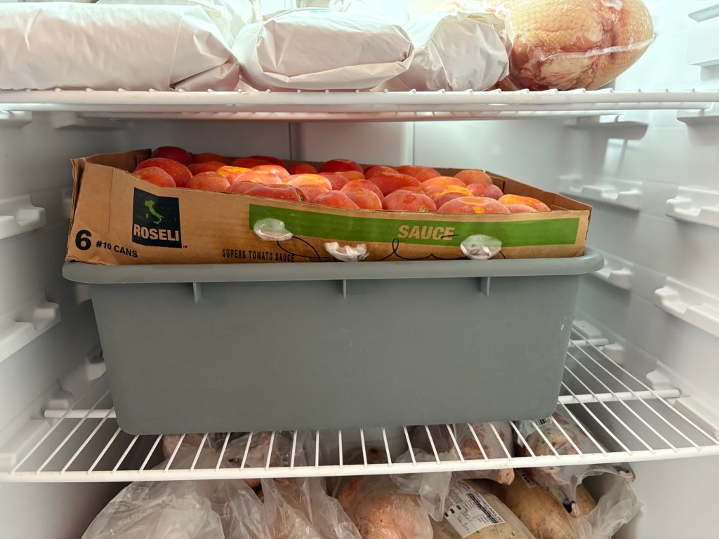 This is the stock of tomatoes being frozen for sauce making after the tomato season is over.