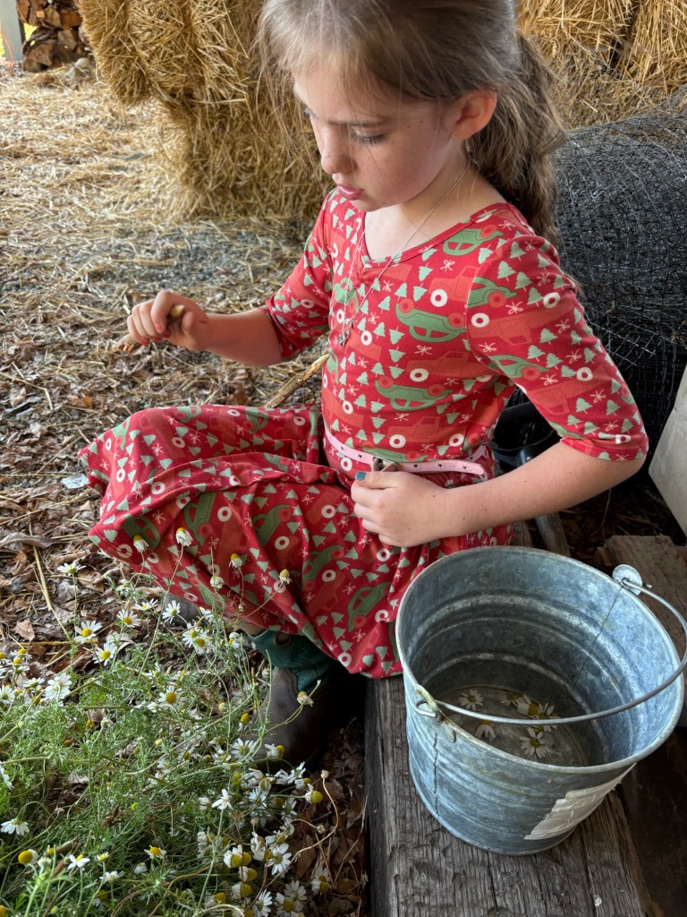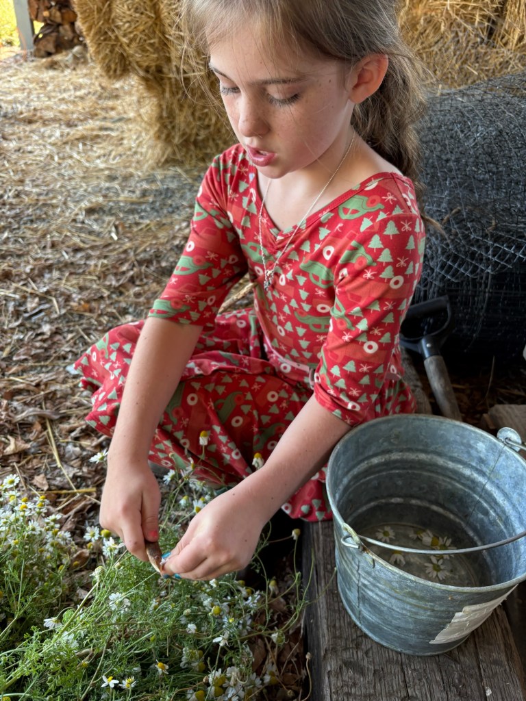 Daddy: “We need to cut the blossoms off these chamomile plants.”