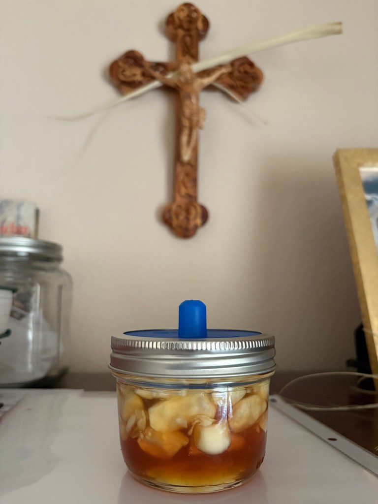 Filled with honey and set to ferment on the top of the piano. We’ll see how it goes. One of our friends from homeschool makes this and it is absolutely fantastic.