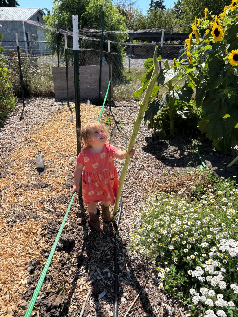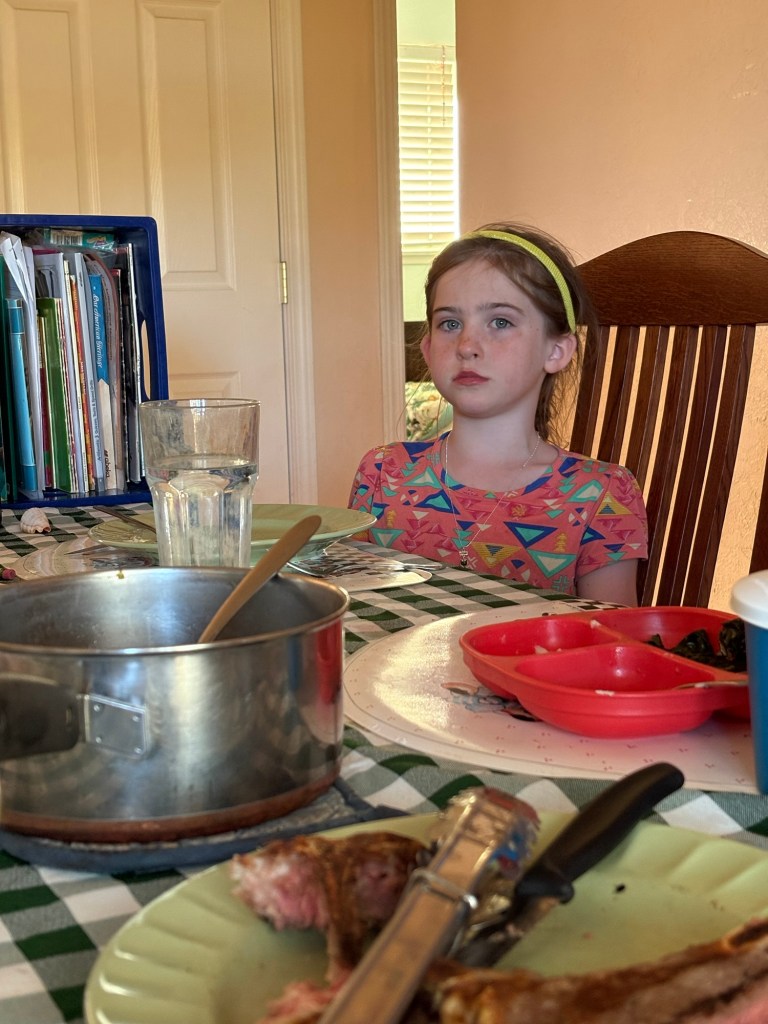 Daddy: Every dish at this meal was produced on the farm. We grew and harvested all the vegetables the day of, and the T-bone steaks came from our steers. This is a picture of Ellie’s face after she finished her food. Usually she is the pickiest eater, who would rather starve than eat anything other than mac and cheese or grilled ham and cheese sandwiches; and rather chatter through a meal than eat anything at all. Last Thursday, however, she helped make the mashed taters, and was ridiculously excited about them. She ate two helpings of mashed potatoes, a helping of beans, a no-thank-you bite of stir-fried chard, and half a T-bone. After finishing her second helping of taters, she looked at Mommy and said, “My tummy hurts.”