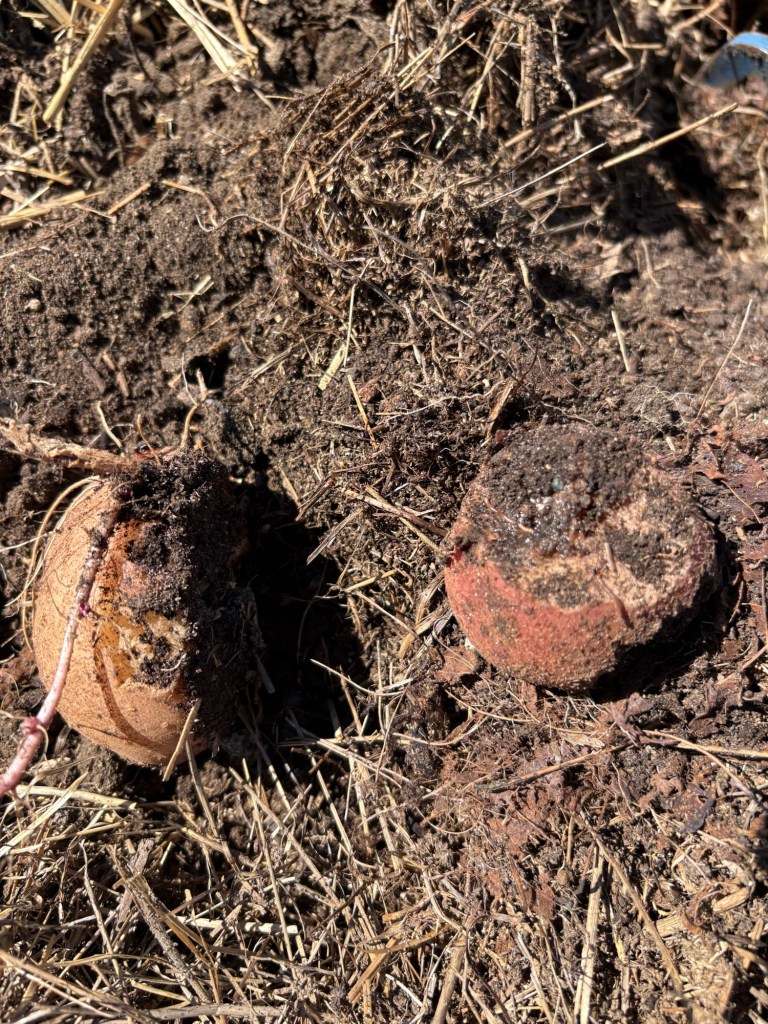 We picked potatoes. These are the yucky potatoes we found that were chewed by some animal I think is a vole.
