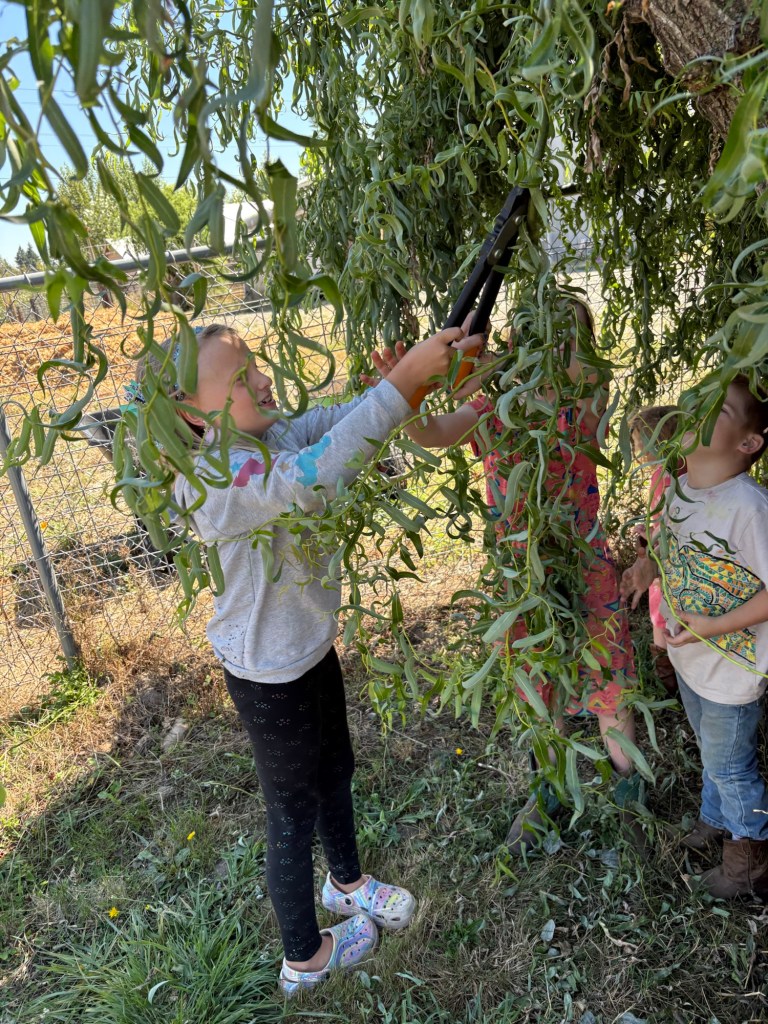 Rhea is helping us clip willow to give to the cow.