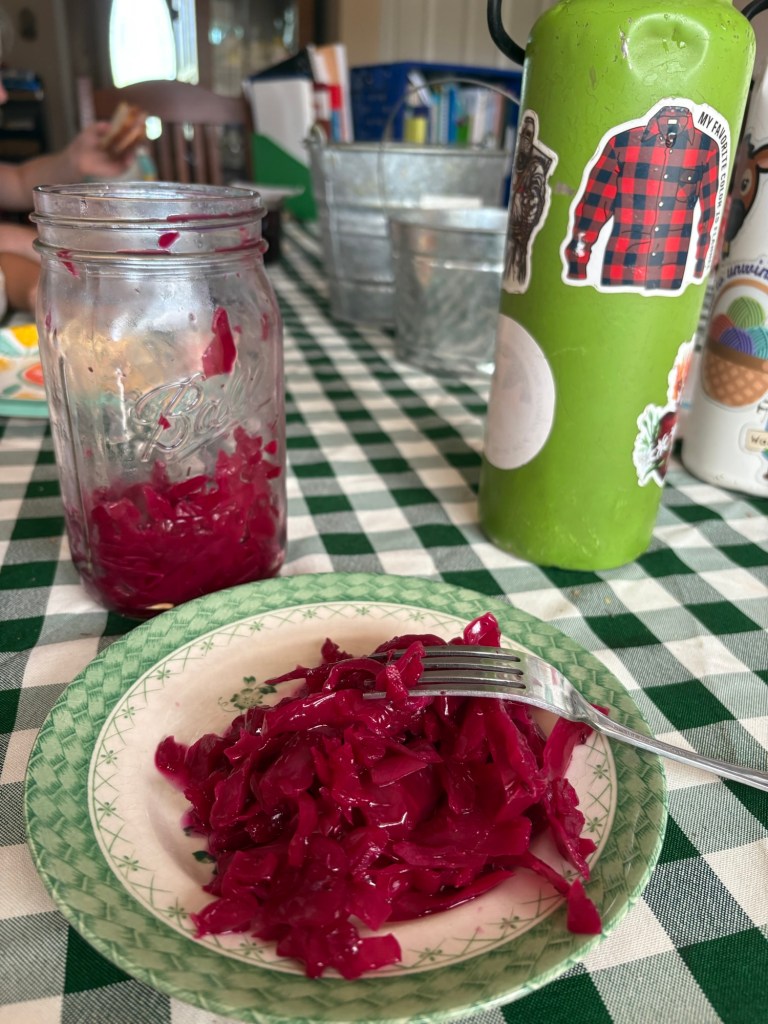 We have two more red cabbage heads in the garden, and a dozen or so green cabbages. We will see what we do with them.