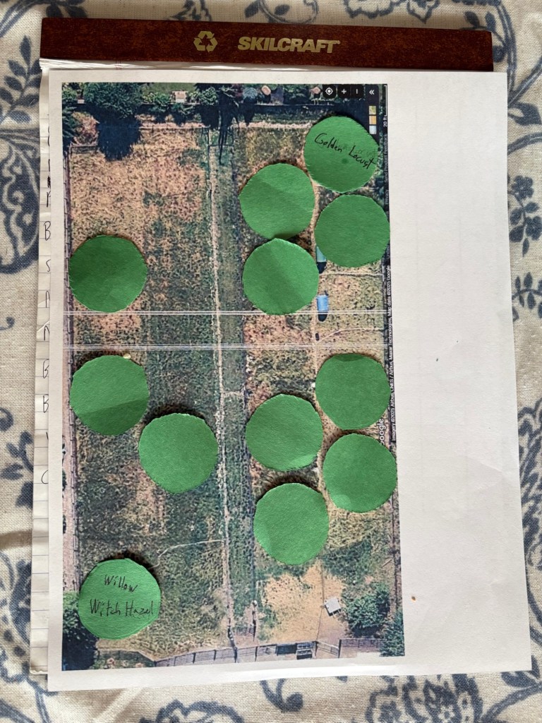 But we have the beginnings of a framework. This is a sketch showing areas that must be kept clear of roots, branches or both. Next, we need to plot out trees and canopies, making sure we have enough shade, but not too little. Because in Western Washington virtually all pasture forage grasses are cool season grasses, we can probably tolerate in the 40-60% range of shade. Then we have to determine species and cultivars, source and price them, and plot and prep the soil, ideally 2-3 months before the trees arrive.