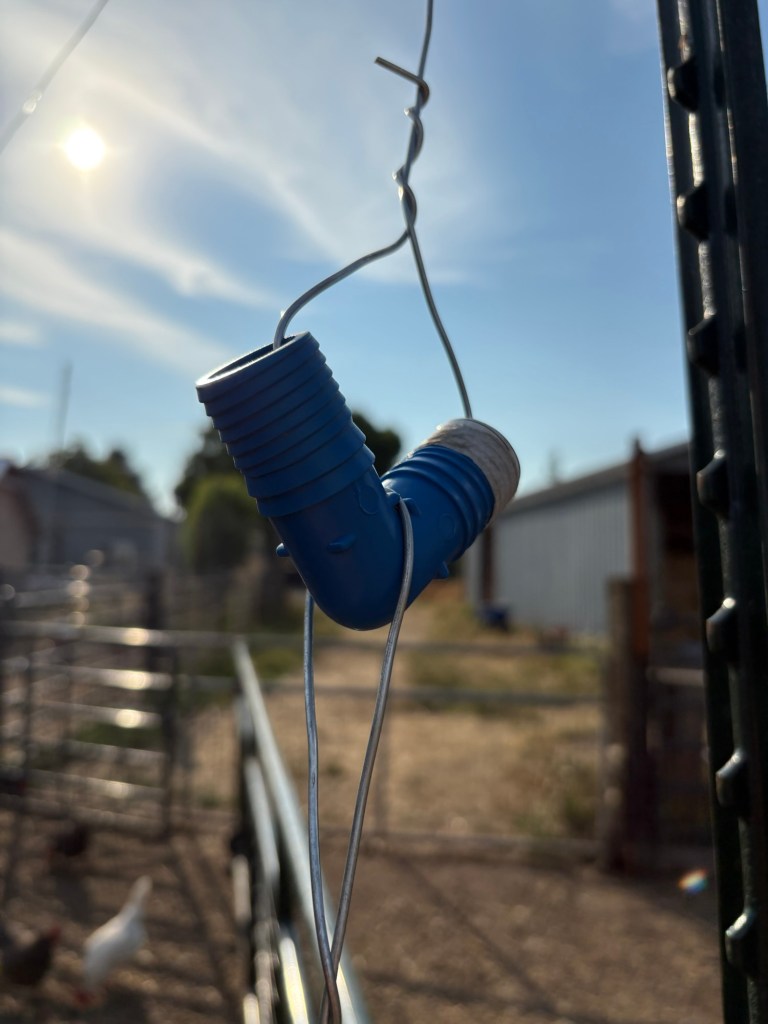 That’s a poly stab fitting, but it was all I had, and it works as an insulator to keep the hot wire up out of reach so people don’t accidentally lean on it.