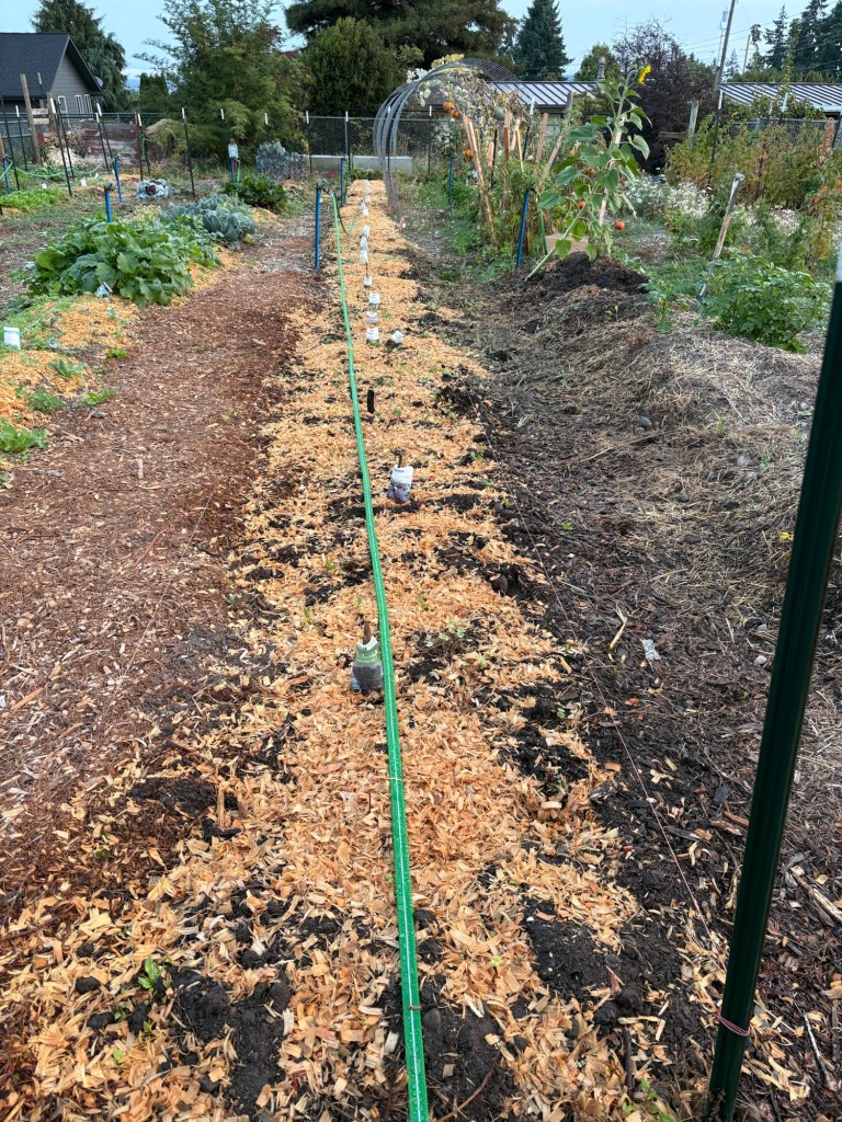 It seems to be working well so far, but it requires support every 20 feet or so, which is doable on the row that had wheat this summer, because it has a t-post on each side, every ten feet. However, the other rows don’t have this, so they are still irrigated with ground laid hoses.